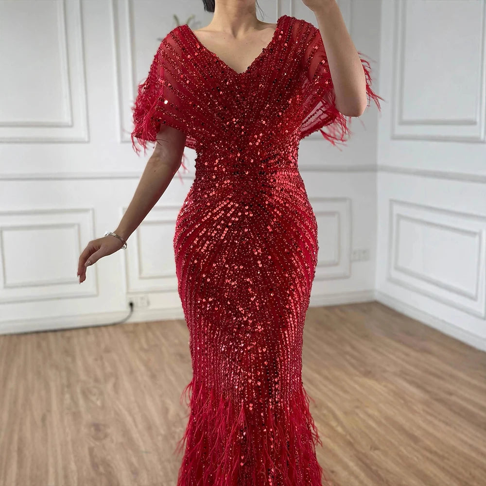 ارفع أي حدث مسائي مع فساتين سهرة دبي الفاخرة في دبي الفاخرة. تضيف الأكمام الأنيقة من الرأس وصورة ظلية حورية البحر لمسة من التطور ، في حين أن الريش الفاخر والتصميم الرائع يجعلان بيانًا جريئًا. مثالي لحفلات الزفاف والحفلات ، هذا اللباس ينضح بالثقة والأناقة.