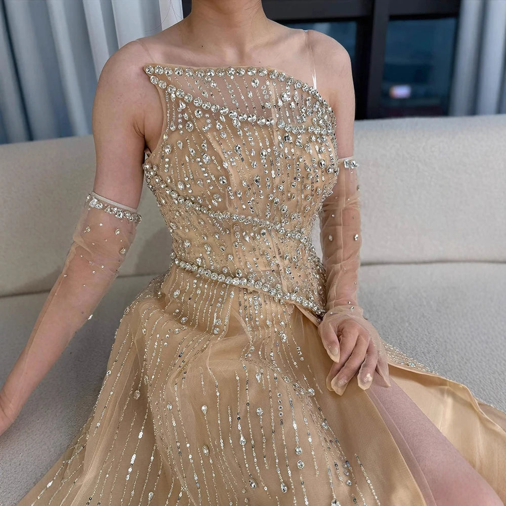 Luxury Nude Crystal Beaded A-Line Evening Dress with Split LA72949