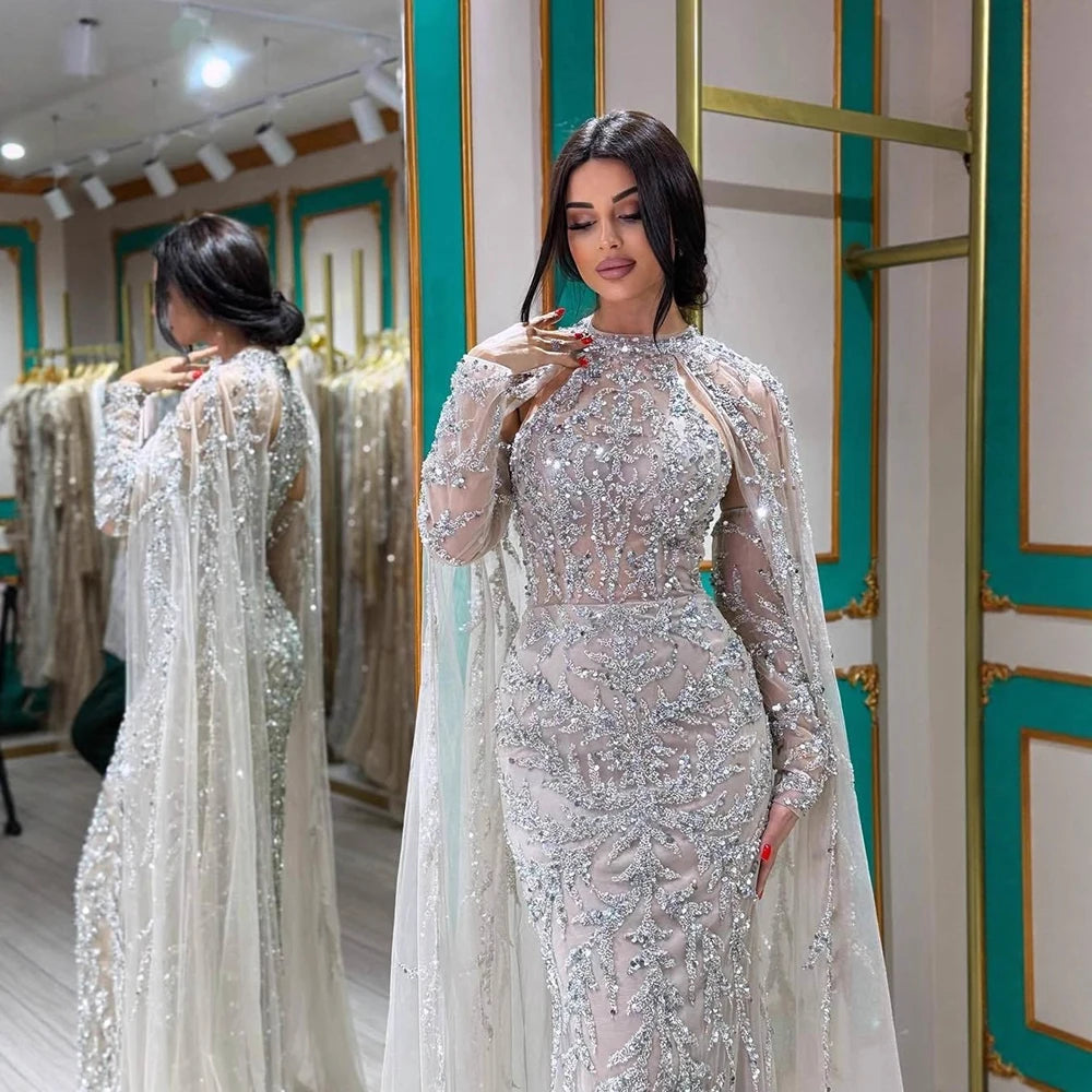 Serene Hill 2025 Fringquoise Cape Sleeve Mermaid Beded Dubai Dubai Dresses Dronses for Women Wedding Party LA72652