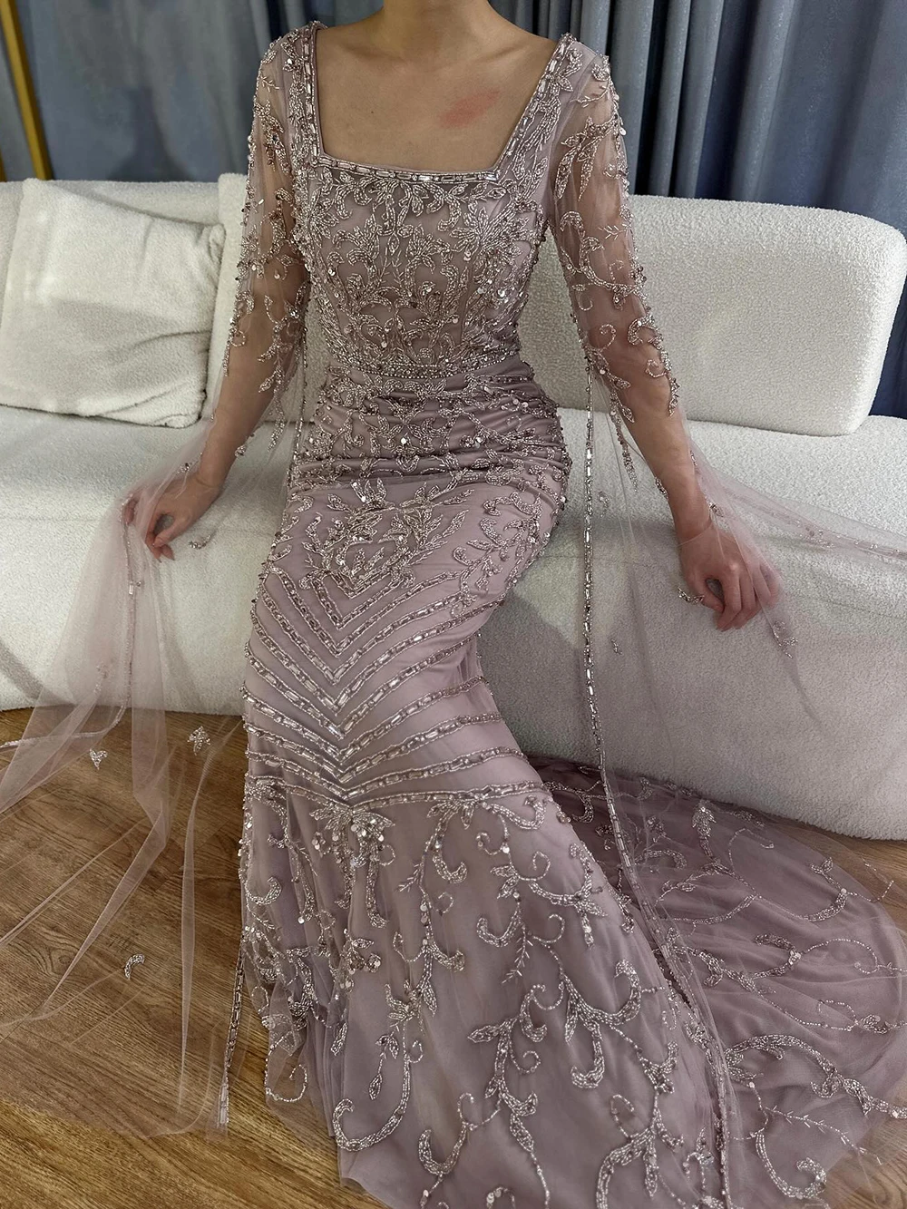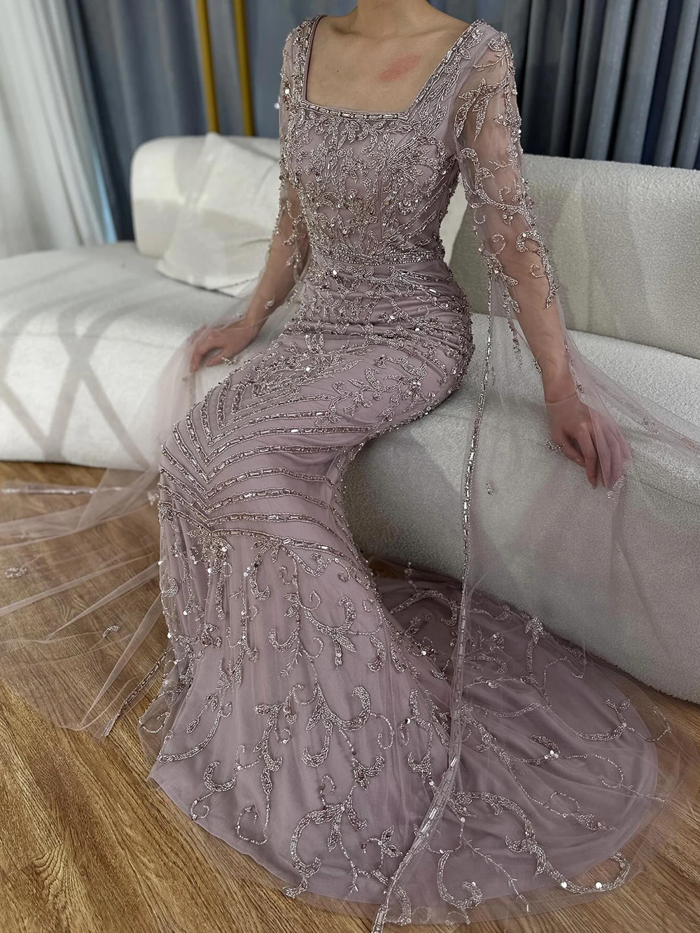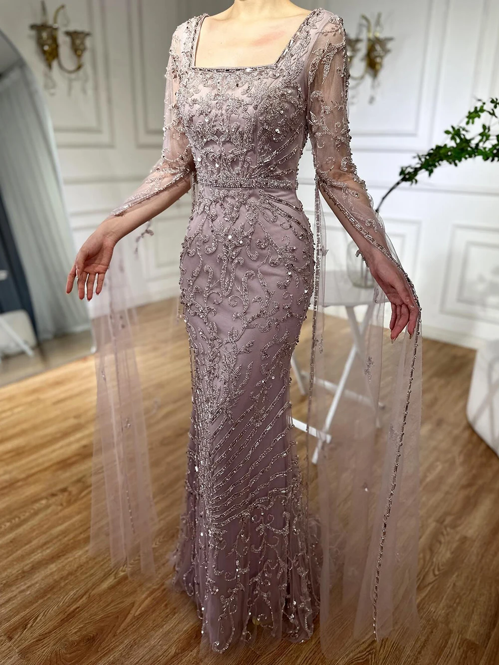 Serene Hill 2024 Arabisches Karamell-Meerjungfrau-Abendkleid mit langen, perlenbesetzten Cape-Ärmeln | Kleid für Damenhochzeitsfeier LA72400A