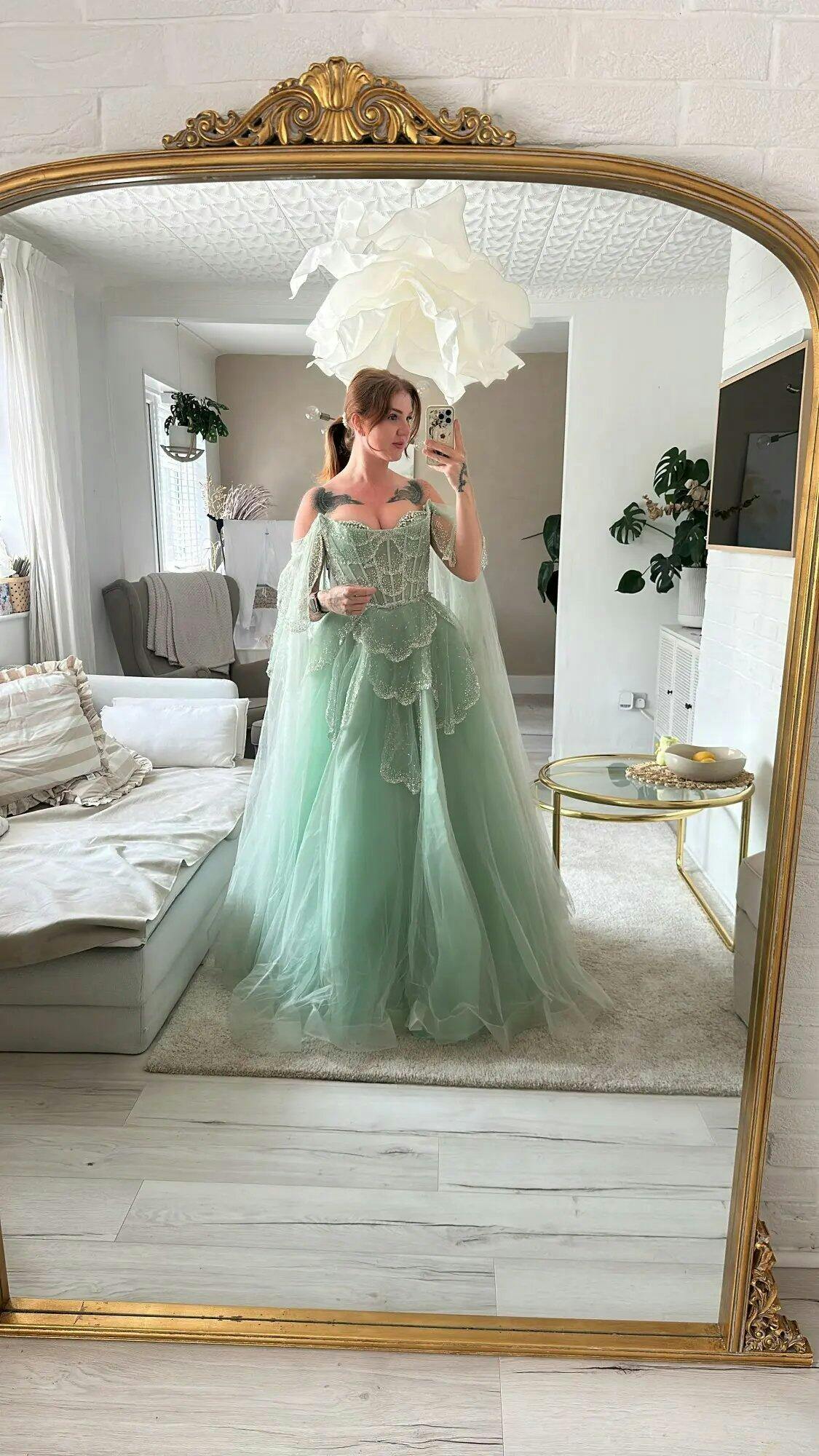 Elegant Arabic sage green evening dress featuring beaded details and cape sleeves. A perfect A-line gown for formal events, weddings, or special occasions.