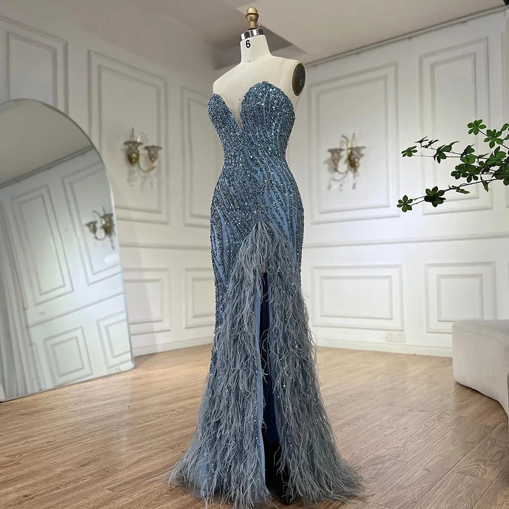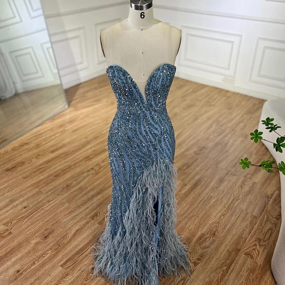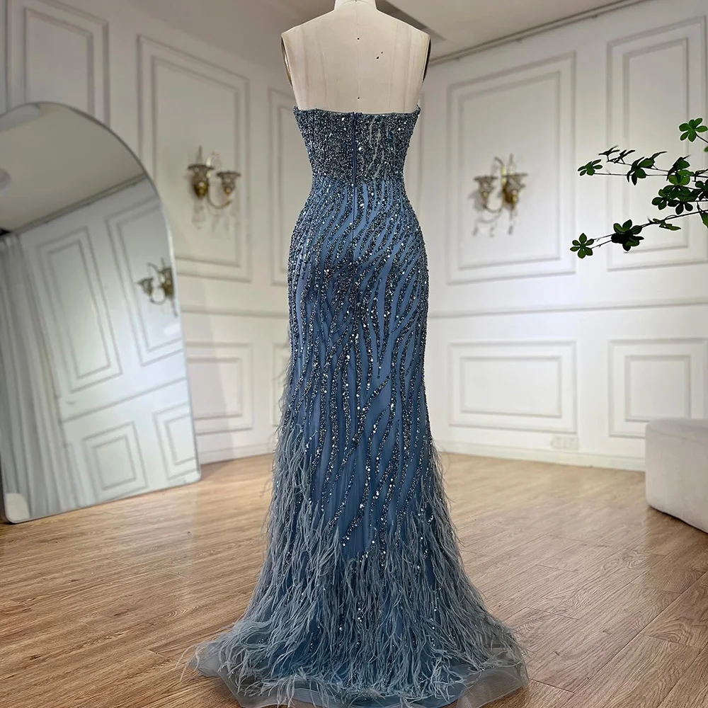 Serene Hill 2024 Arabisches trägerloses blaues Perlenfeder-Luxus-Abendkleid aus Dubai mit Seitenrock für Damenparty LA72695