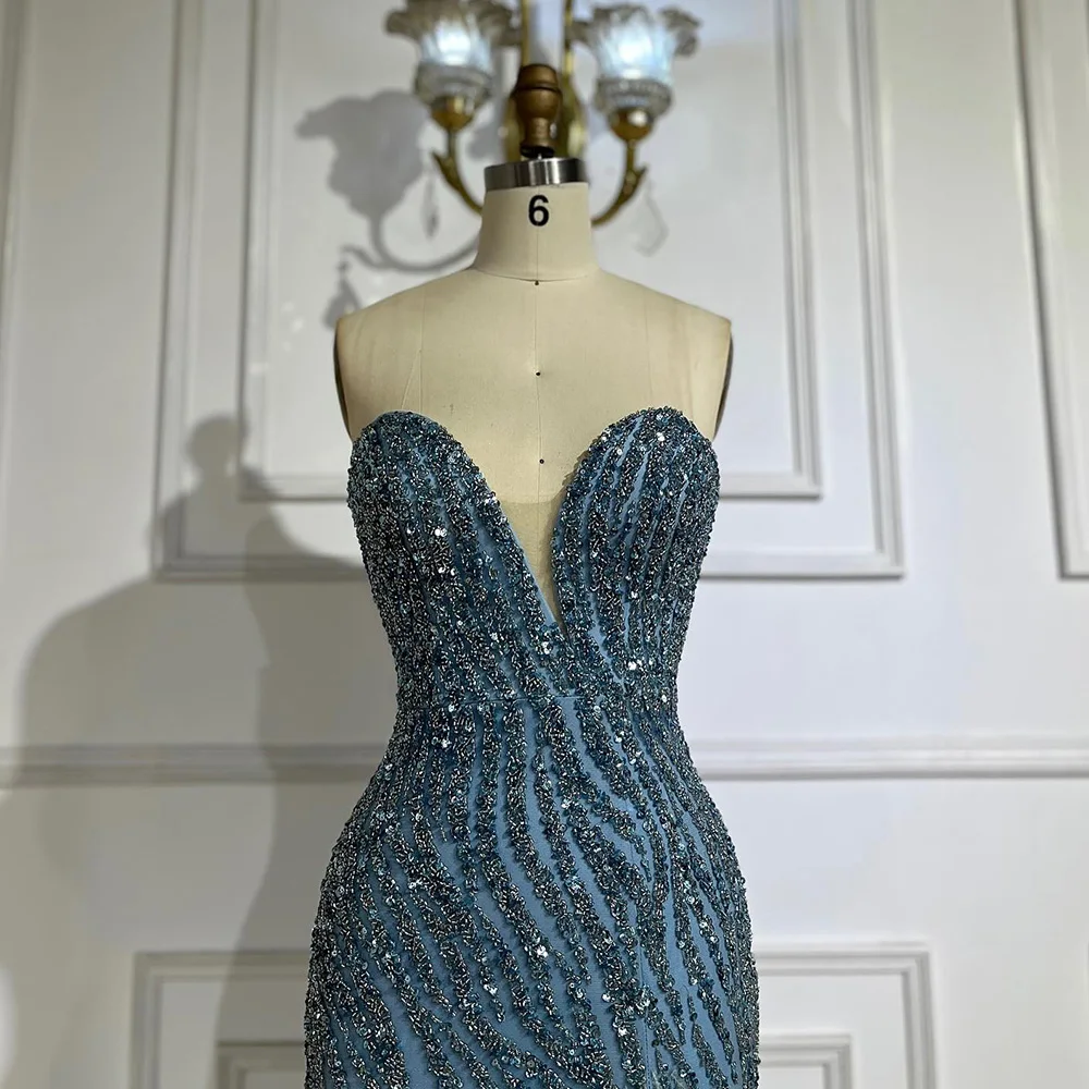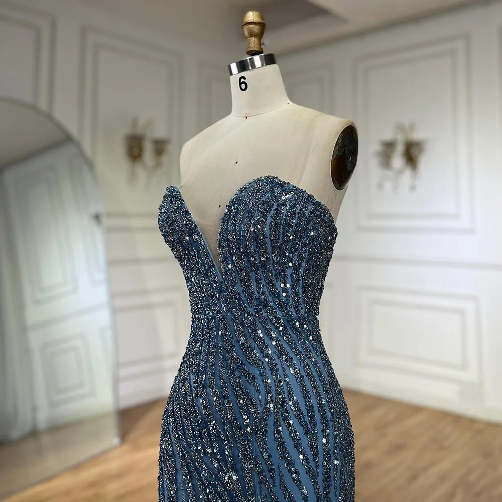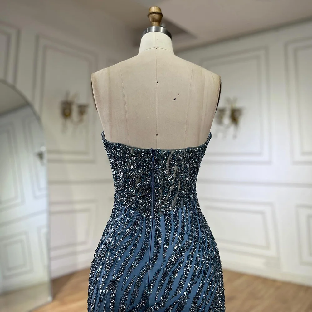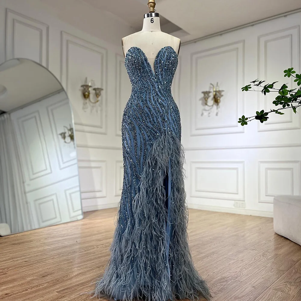 Serene Hill 2024 Arabisches trägerloses blaues Perlenfeder-Luxus-Abendkleid aus Dubai mit Seitenrock für Damenparty LA72695
