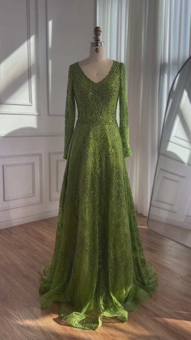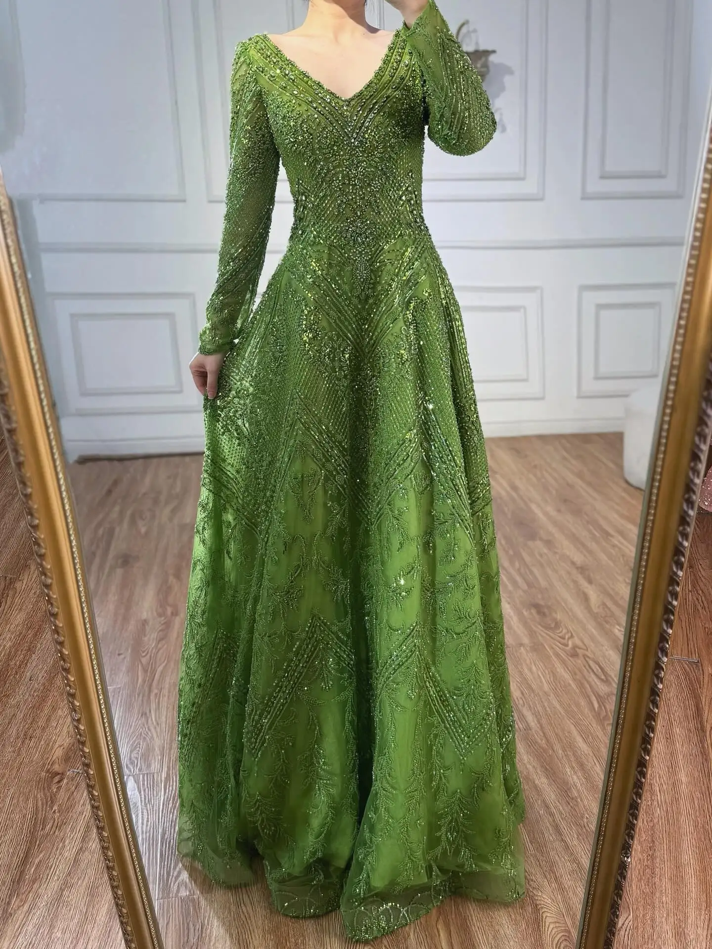 Luxury lime green lace beaded long sleeve evening dress LA73324 featuring elegant Dubai design for stylish women. Perfect for parties and special occasions.
