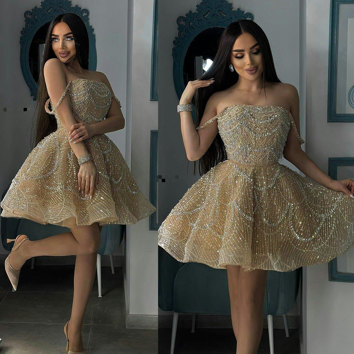 Luxury nude short cocktail party dress with crystal bead embellishments and an elegant A-line silhouette. Perfect for chic events and semi-formal occasions.