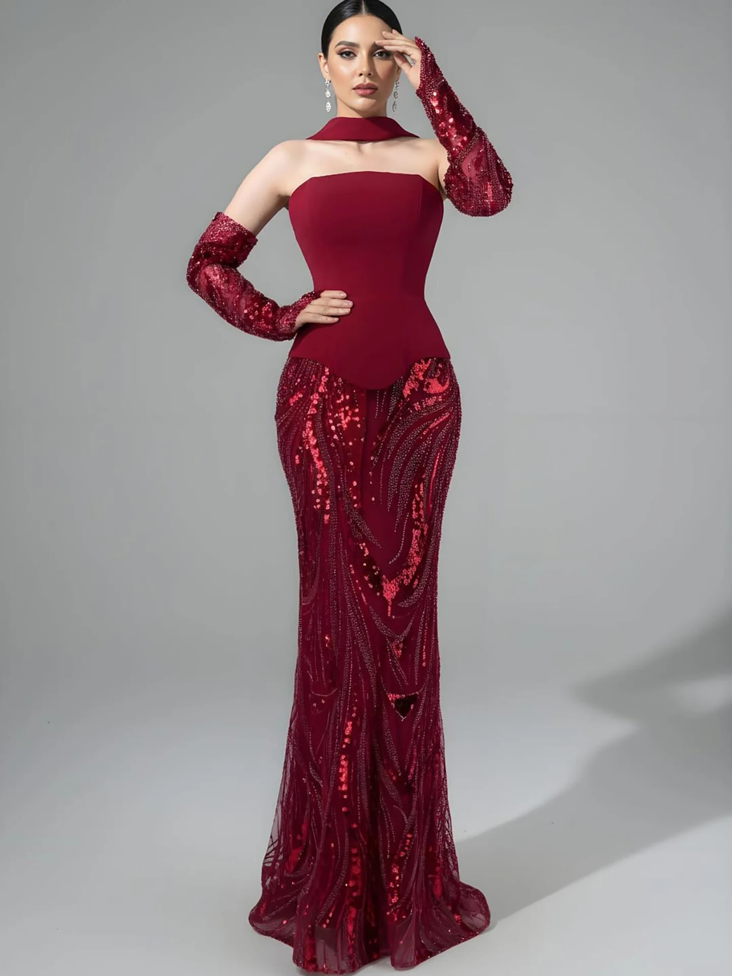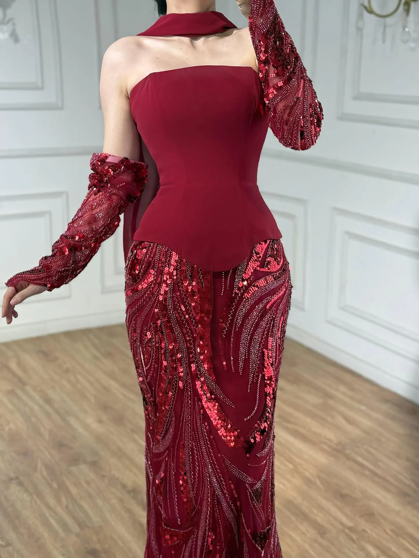 Luxury wine red mermaid evening dress with elegant gloves, crafted for formal occasions, evening parties, and special events.