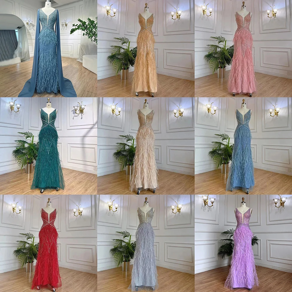 Serene Hill Arabisch Blau Meerjungfrau Elegant Mit Cape Luxus Perlen Feder Dubai Abendkleider Kleider für Frauen Party LA71583B