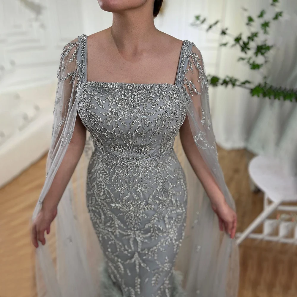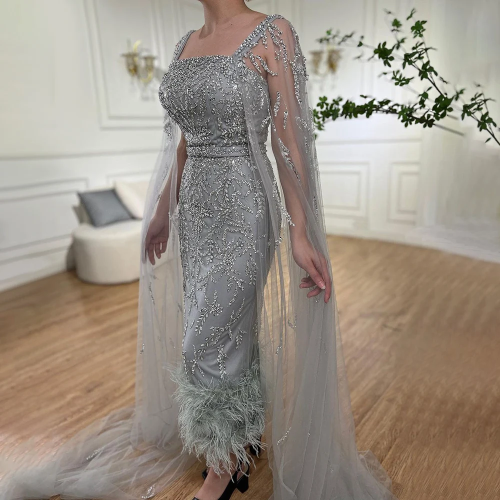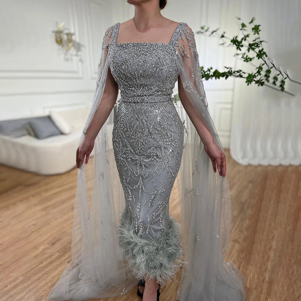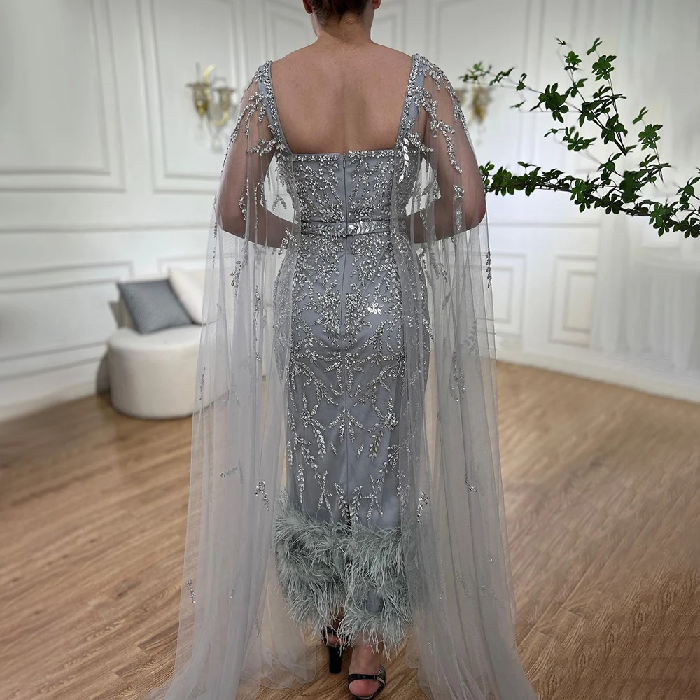 Serene Hill Lila Meerjungfrau Knöchel Länge Midi Feder Perlen Luxus Abendkleider Mit Cape Kleider Für Frauen Party 2024 LA71841