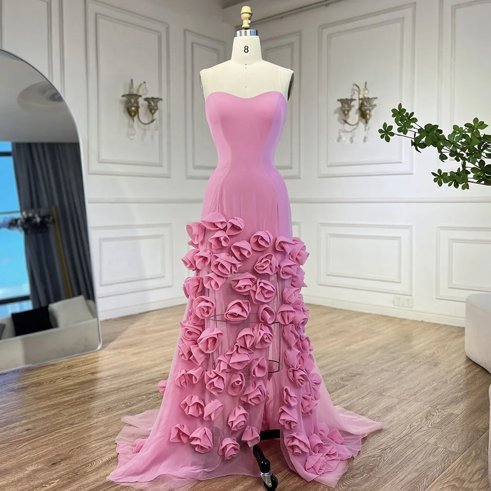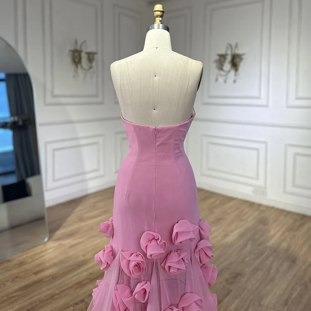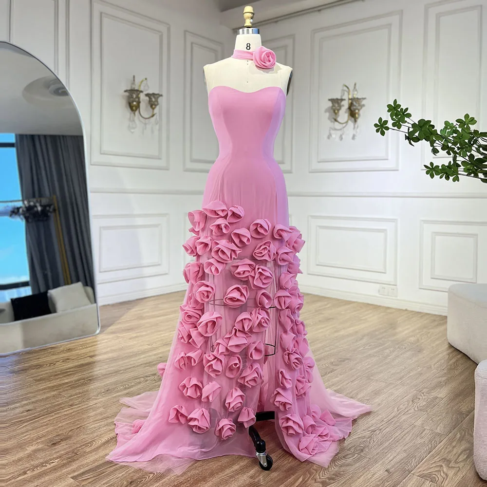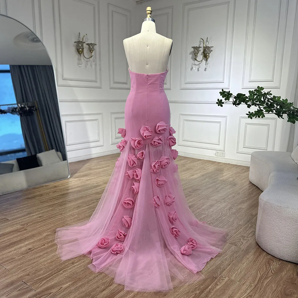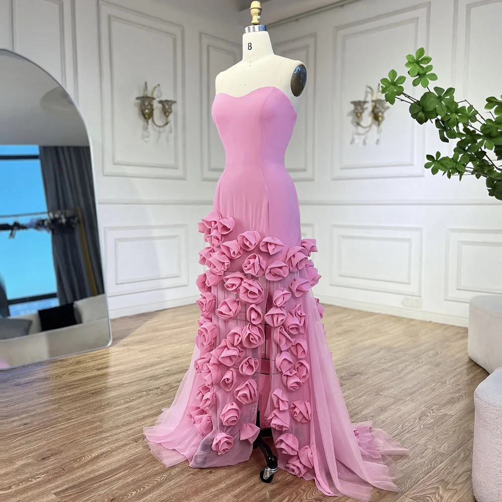 Serene Hill Meerjungfrau Abendkleid für Mädchen Arabisch Rosa 3D Blumen Elegantes schulterfreies Kleid Seitlicher Schlitz Abschlussball Partykleider LA72568