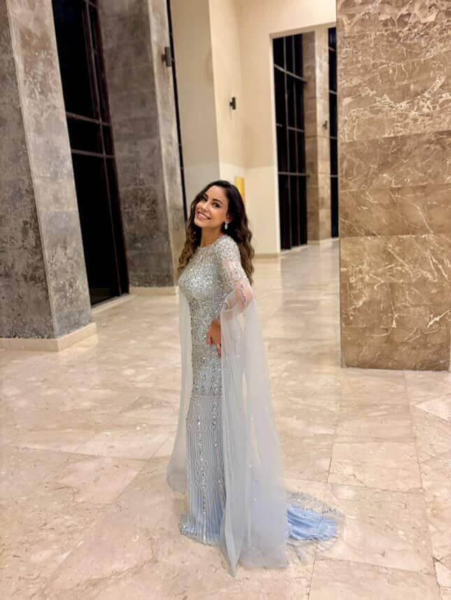 Step into refined glamour with this Dubai-inspired caramel evening gown, featuring elegant cape sleeves and luxe beading—available in two sophisticated shades.