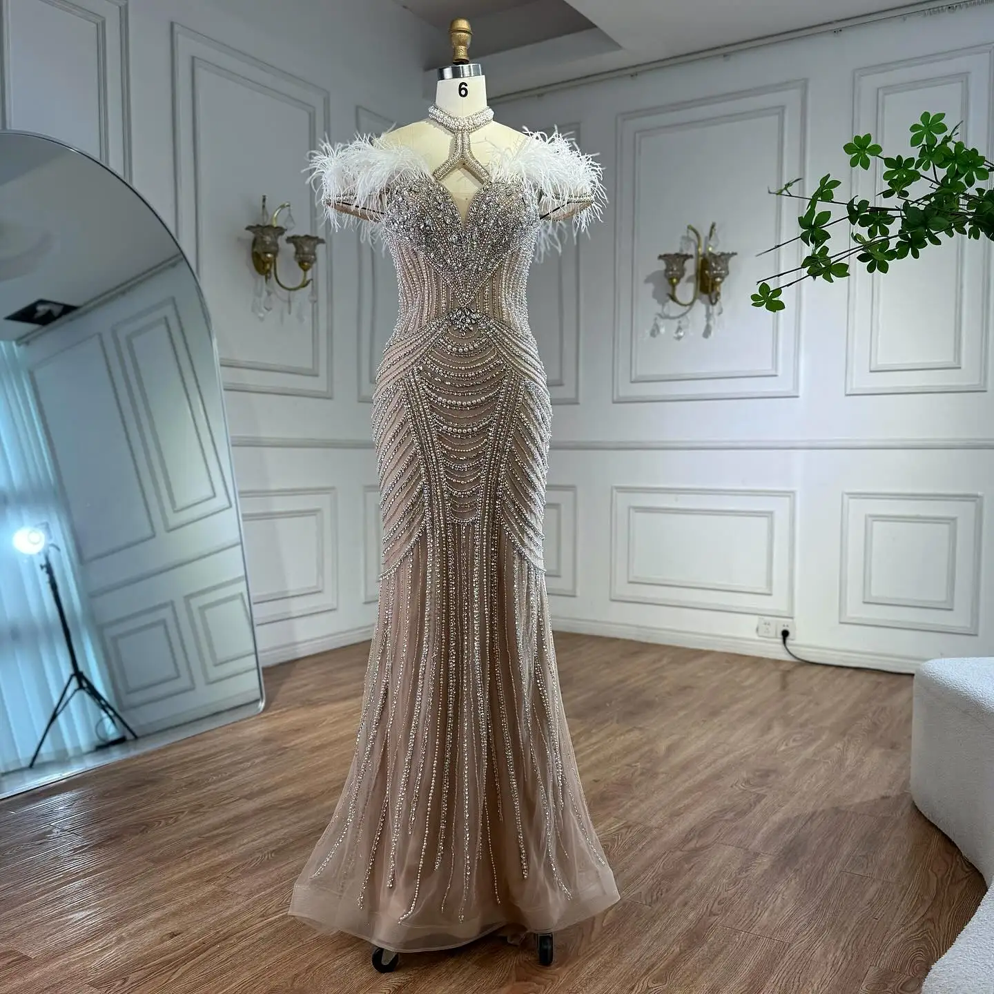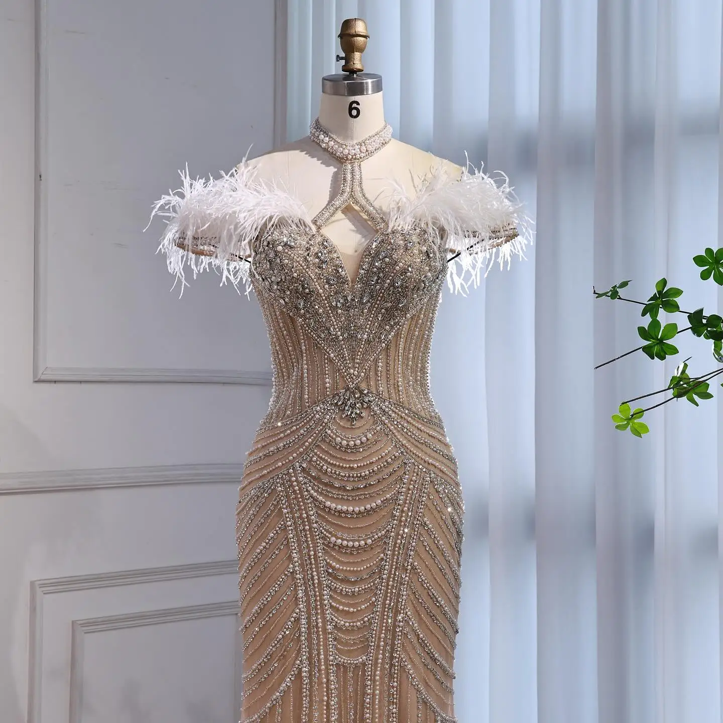 Luxury Pink Feather Halter Beaded Evening Gown for Wedding Party LA73212