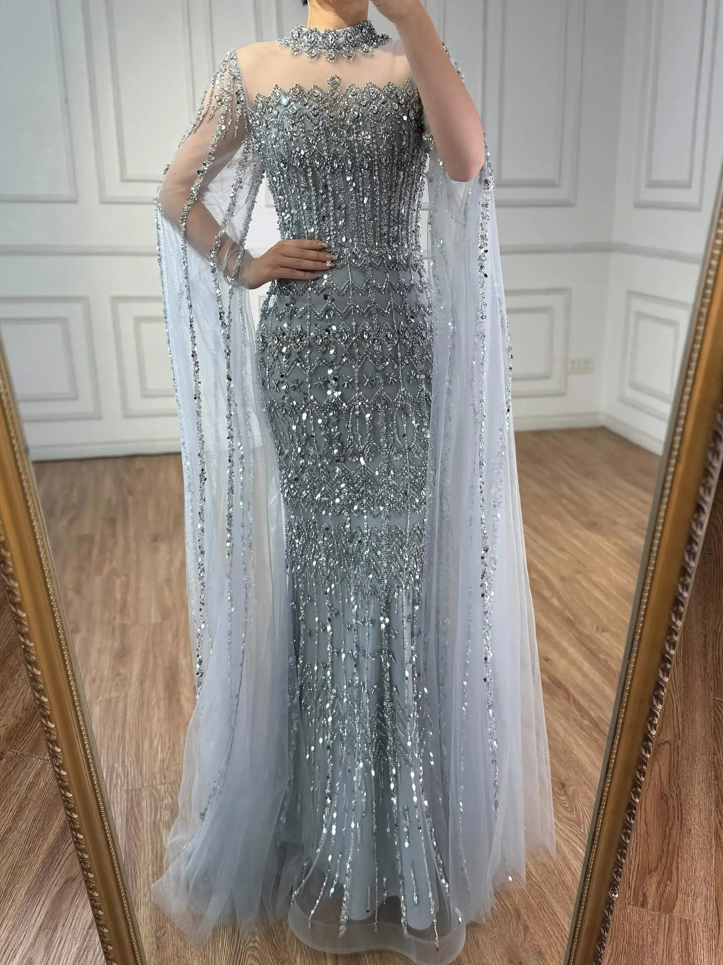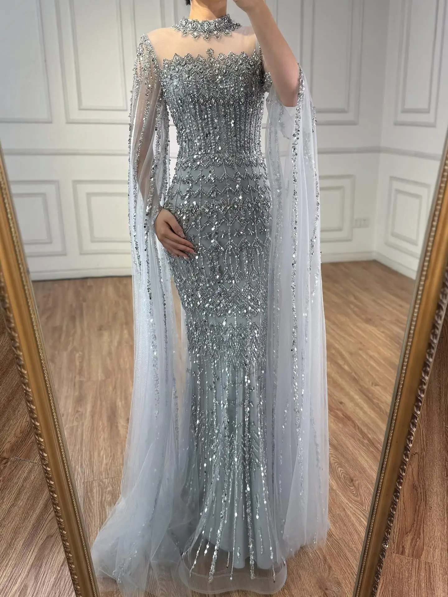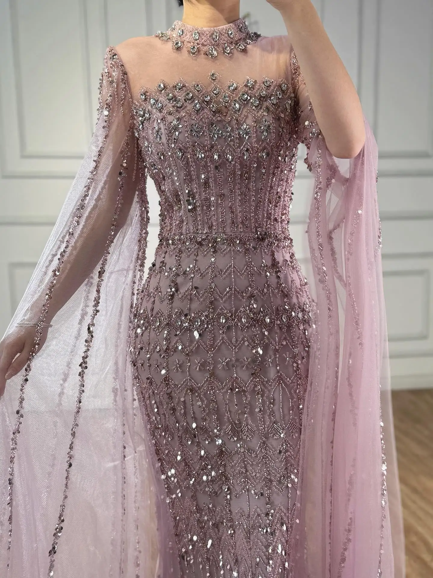 Luxury Nude Beaded Evening Dress with Long Cape Sleeves LA72714A