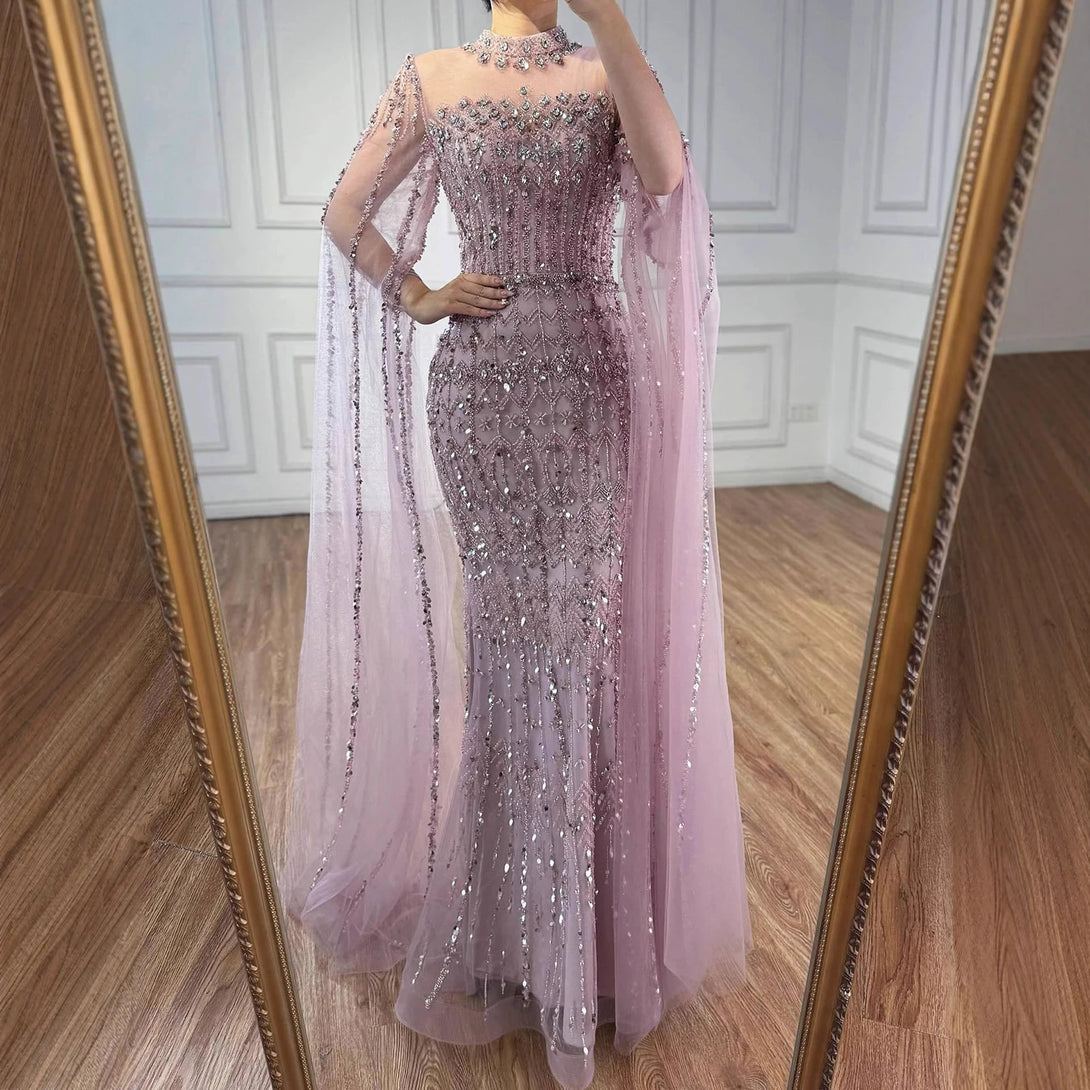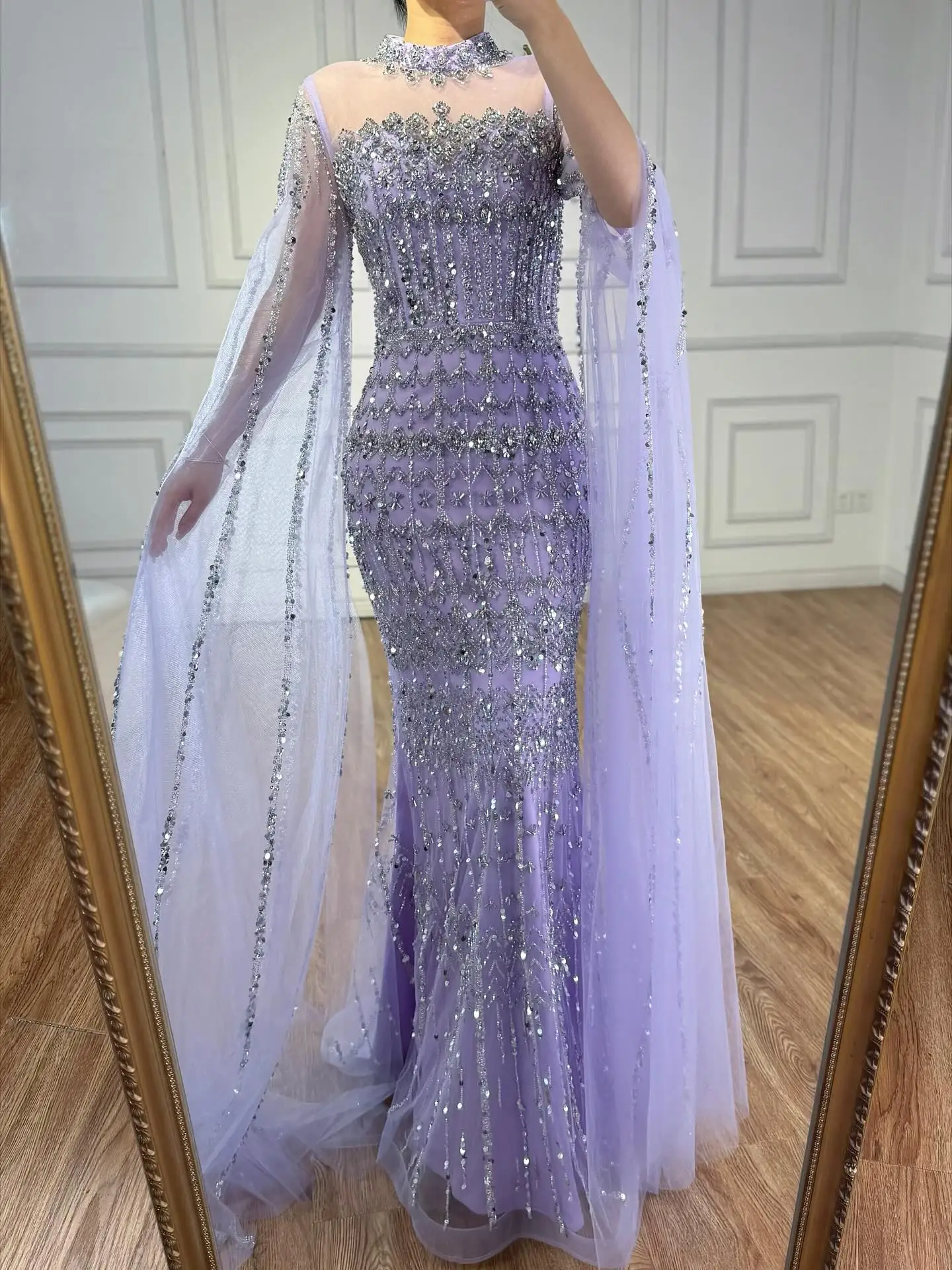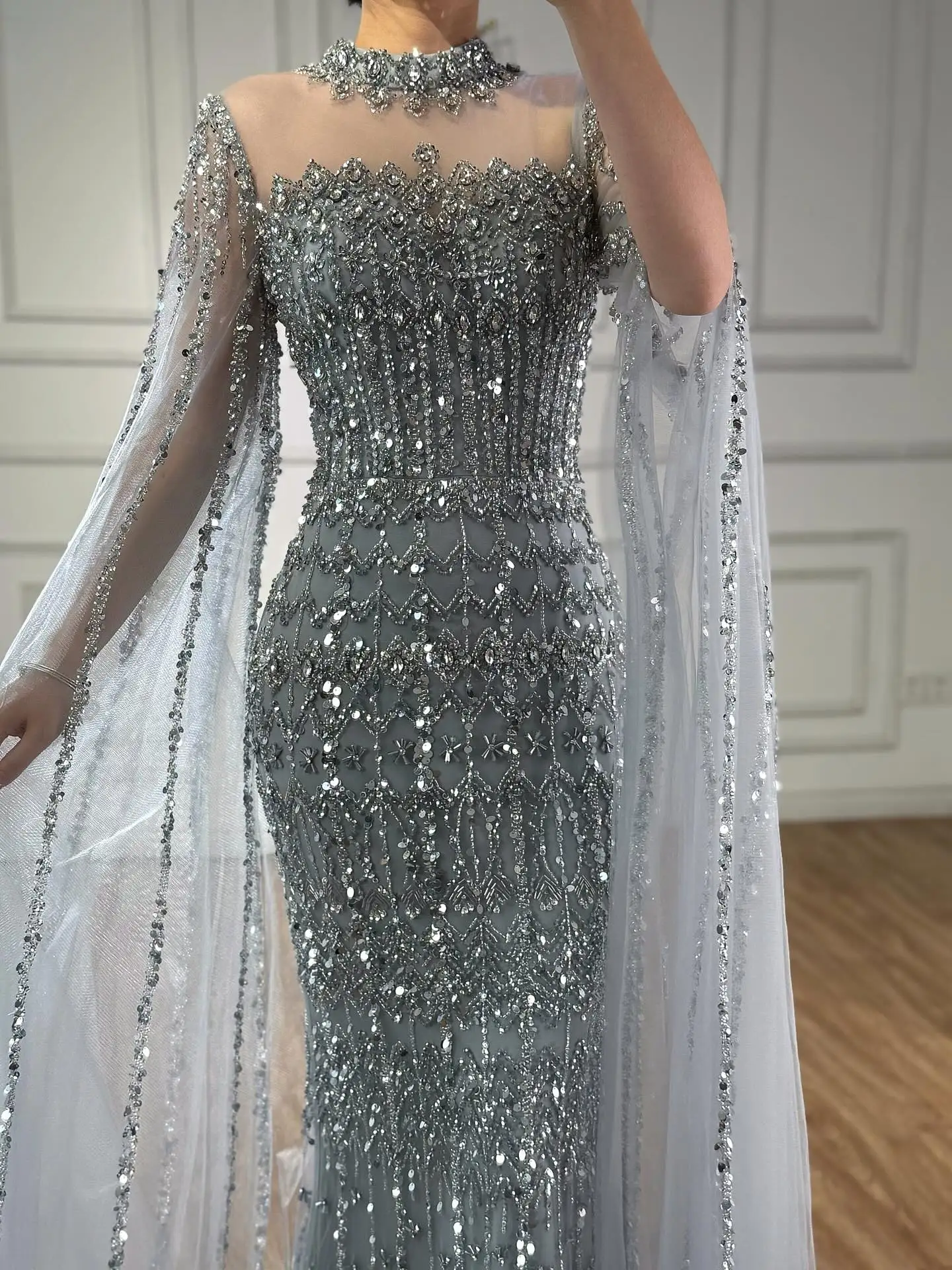 Luxury Nude Beaded Evening Dress with Long Cape Sleeves LA72714A