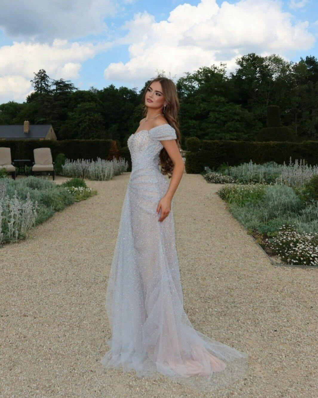 Shine in a luxury mermaid gown with designer beading and a flawless silver-nude palette—crafted for standout elegance and available in two refined color options.