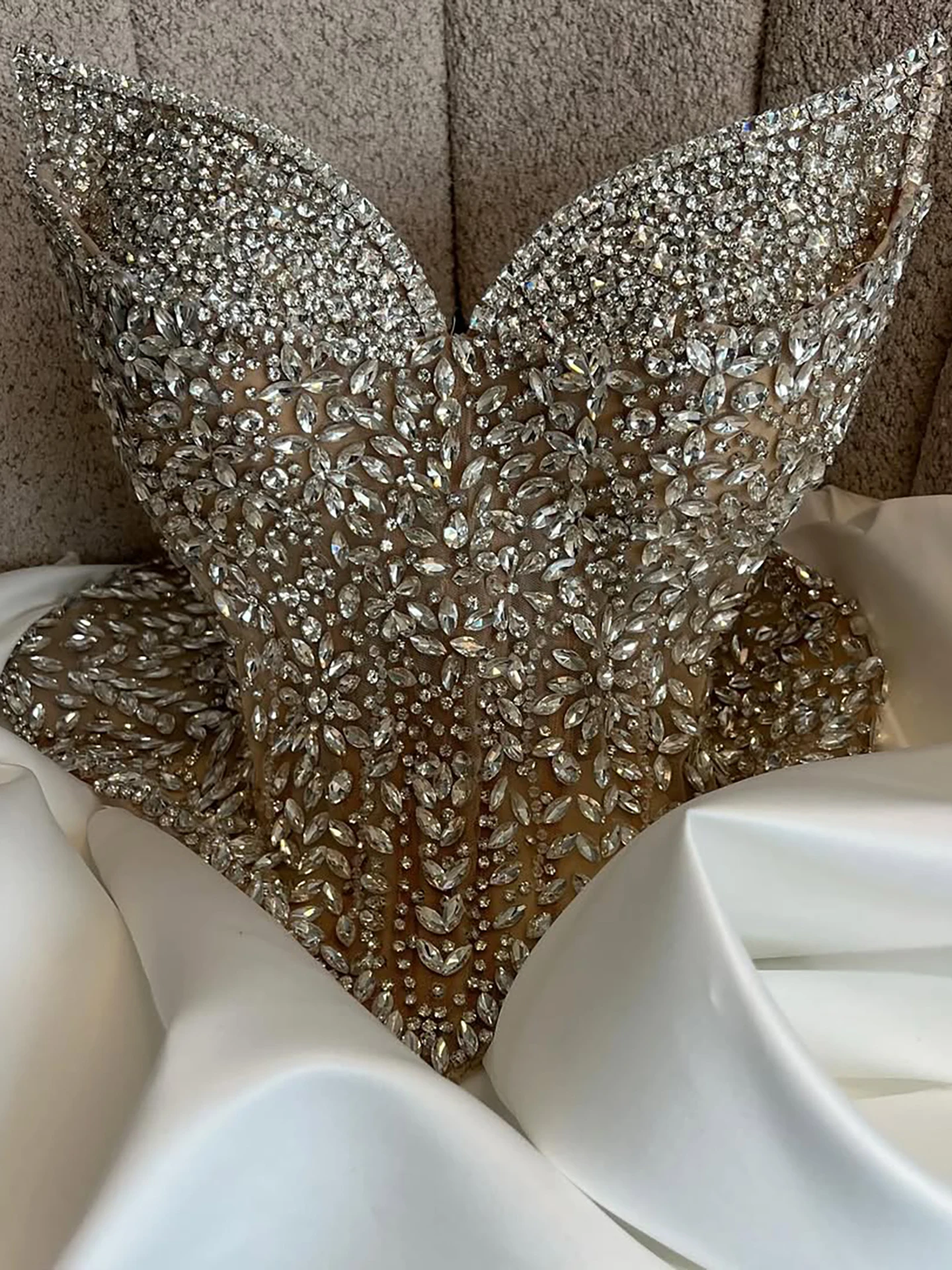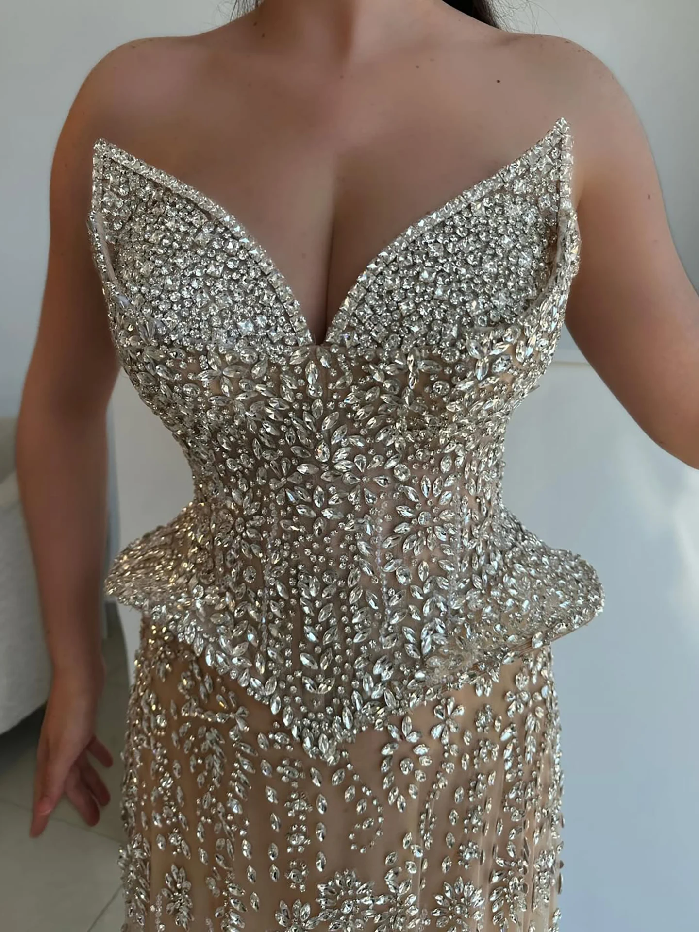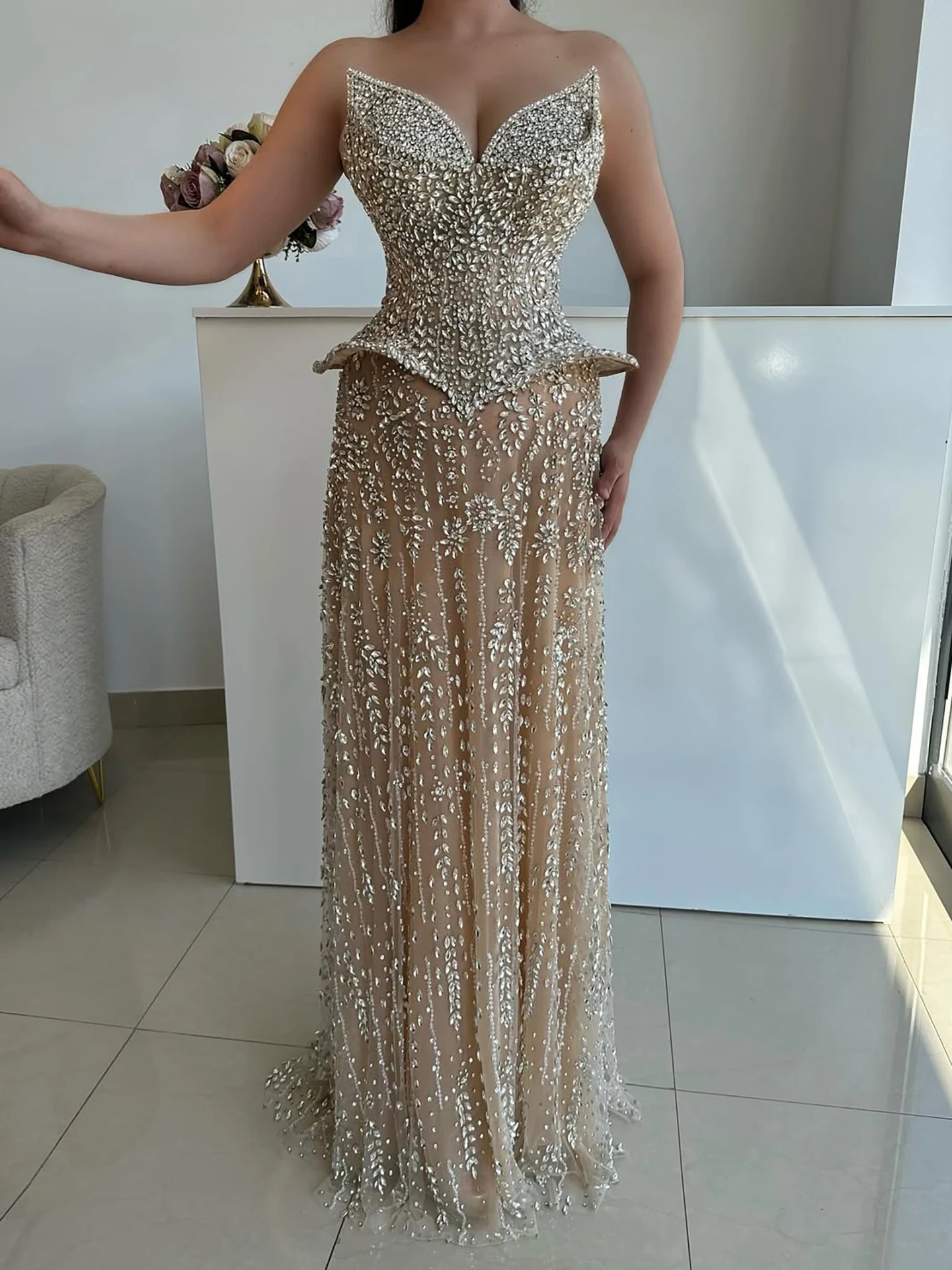 Elegant Kosovo-style two-piece crystal A-line evening gown LA73209, perfect for wedding guests or formal celebrations.