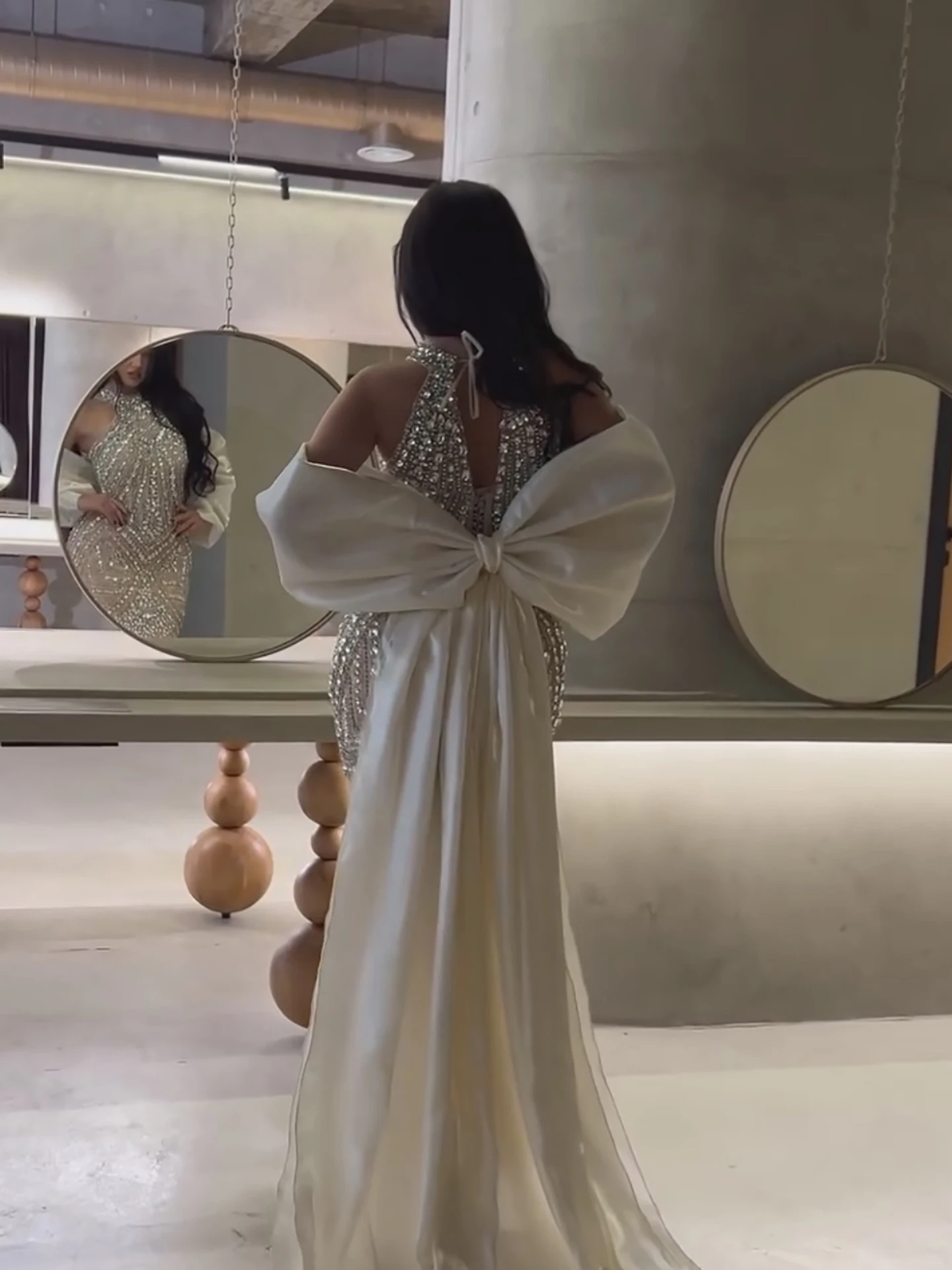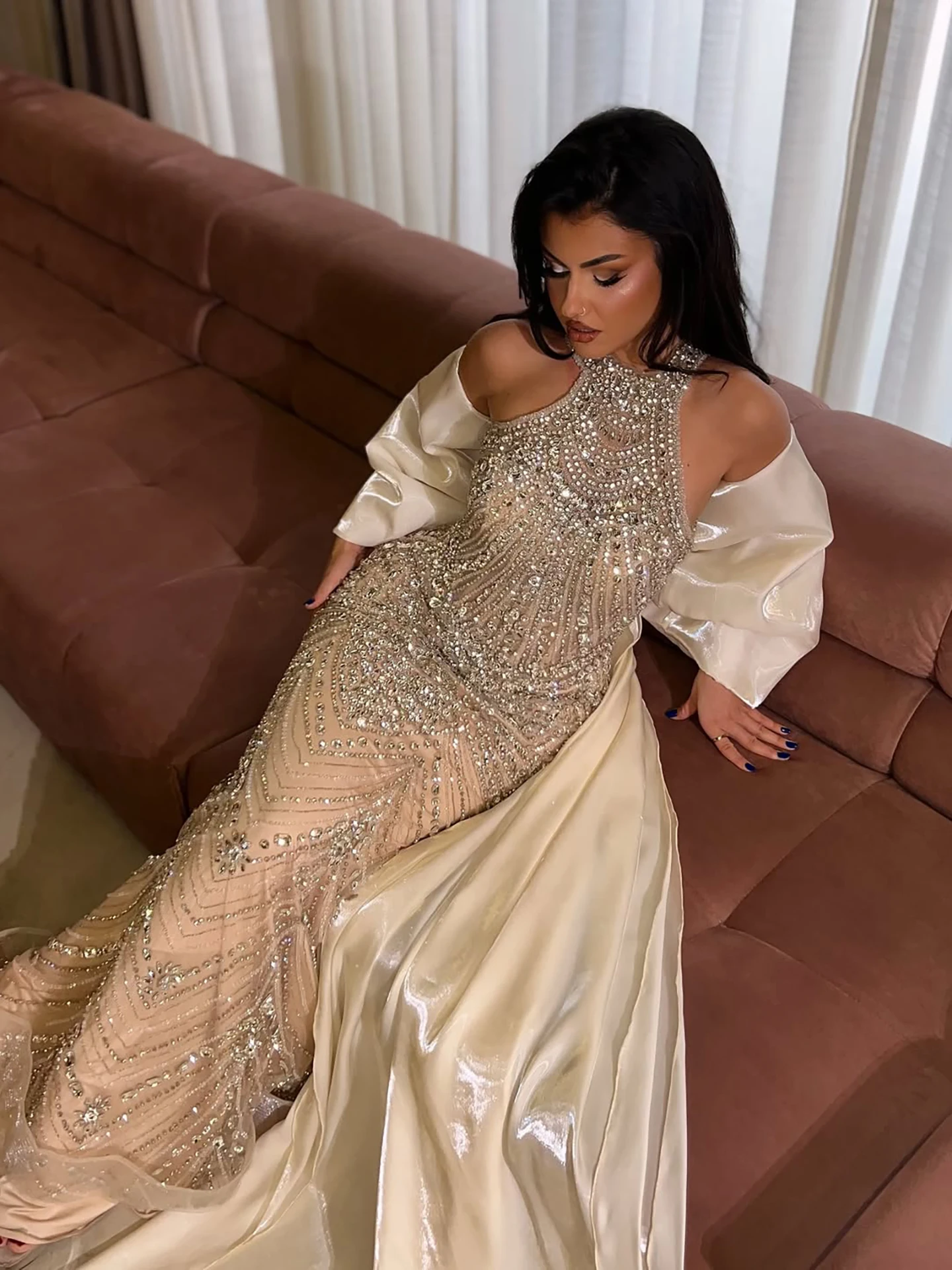 Luxury Kosovo Nude Halter Beaded Evening Dress with Bow Cape LA73218