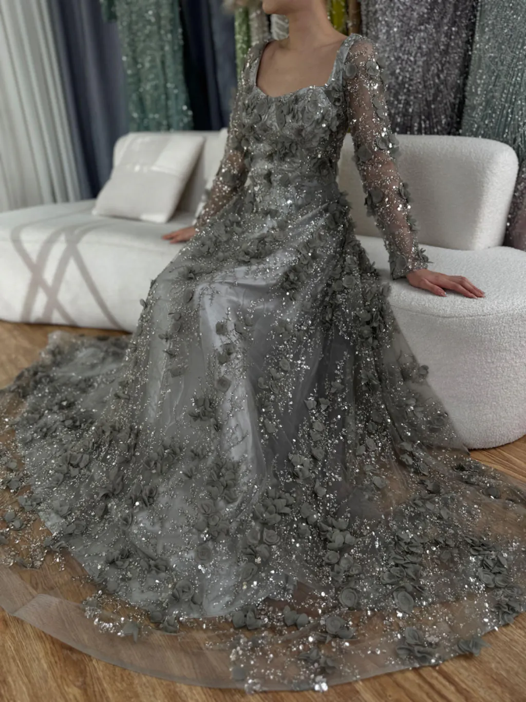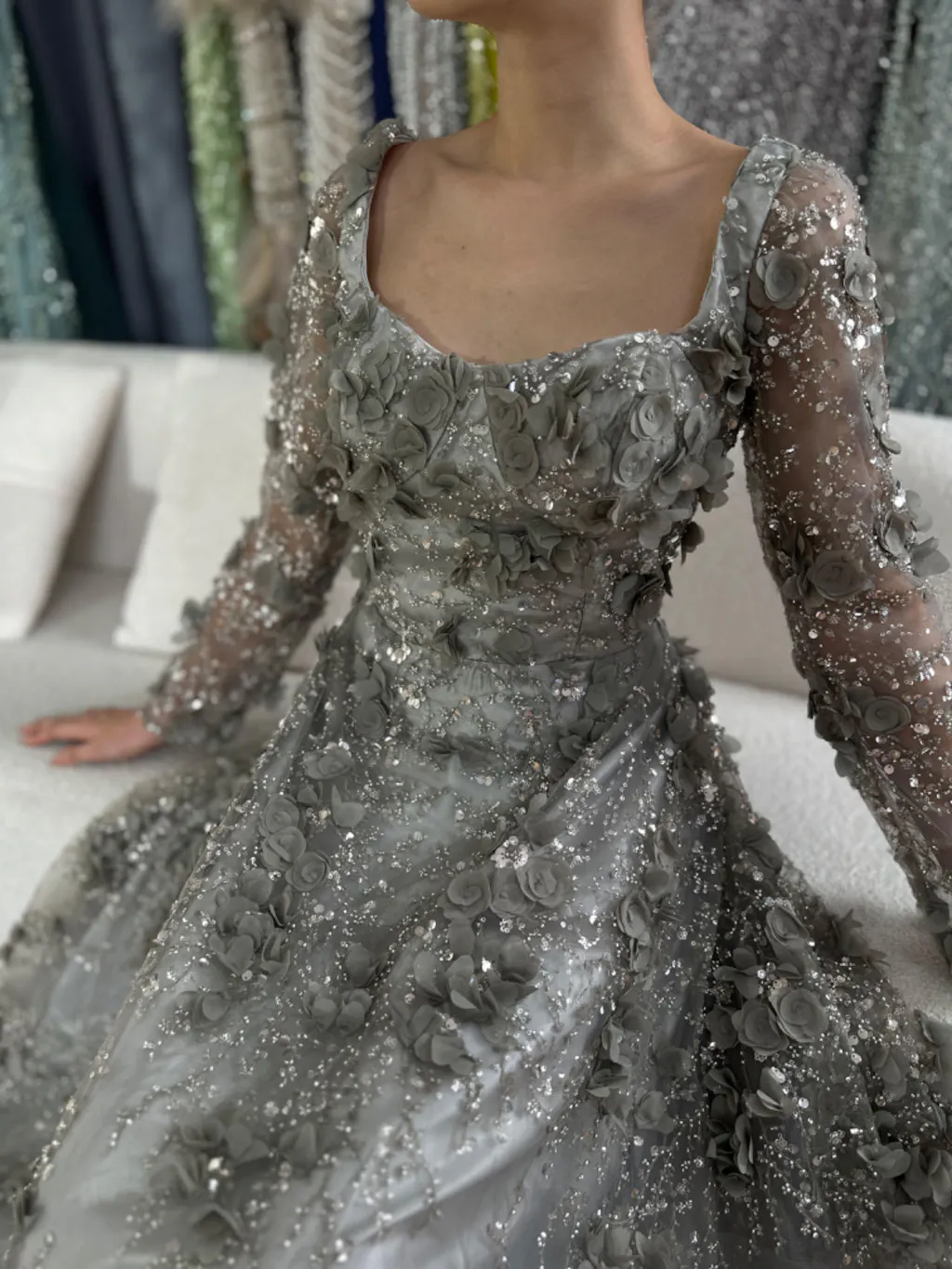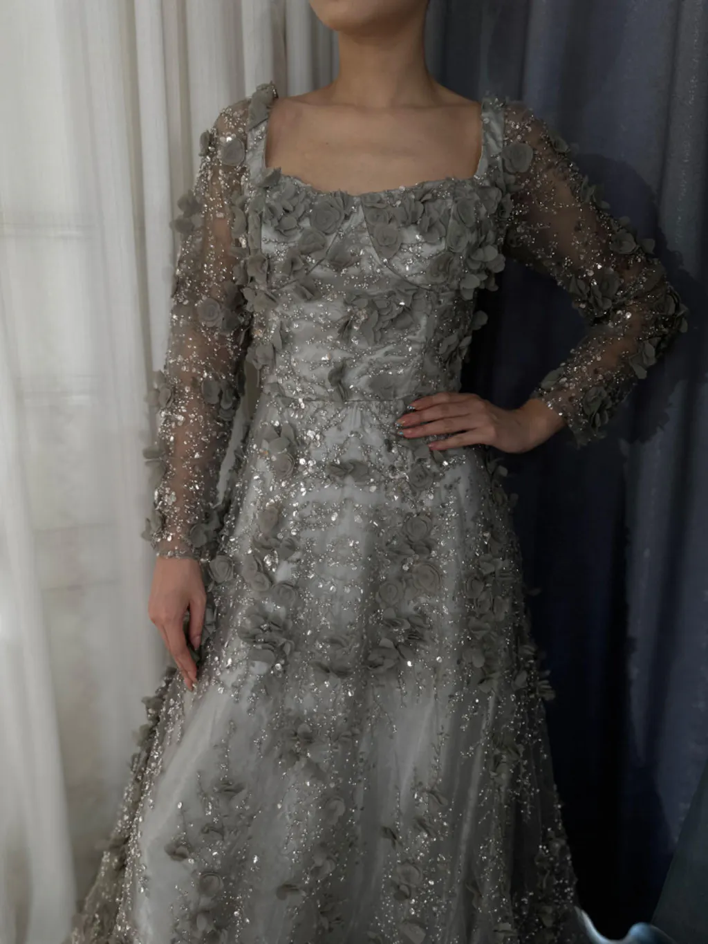 Luxury Arabic Gray A Line Elegant 3D Flower Evening Dress Long Sleeve LA72657 - SERENE HILL