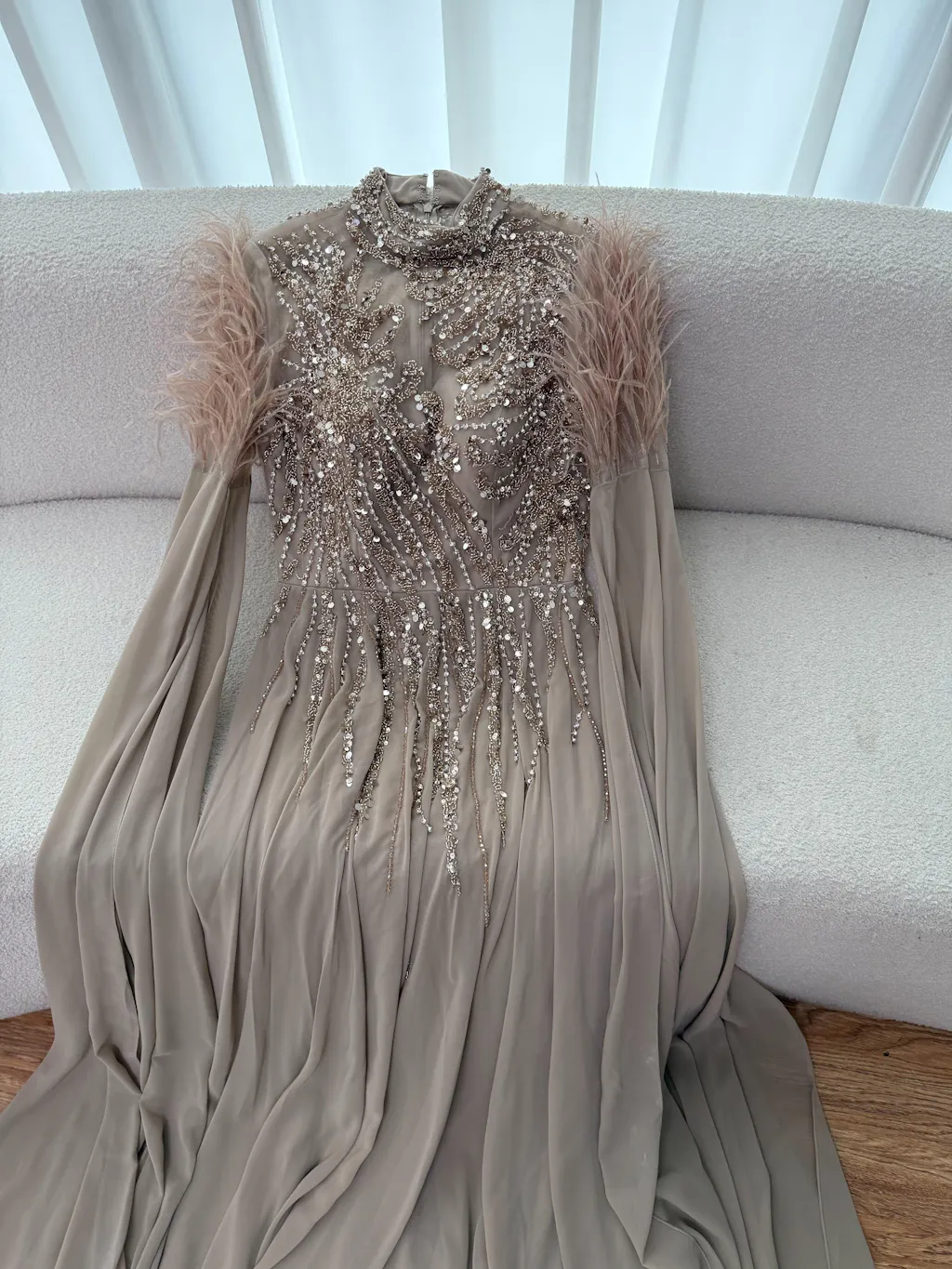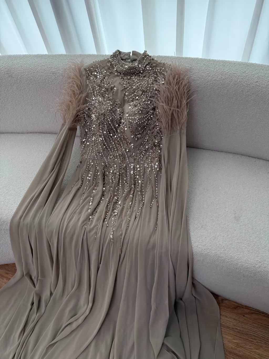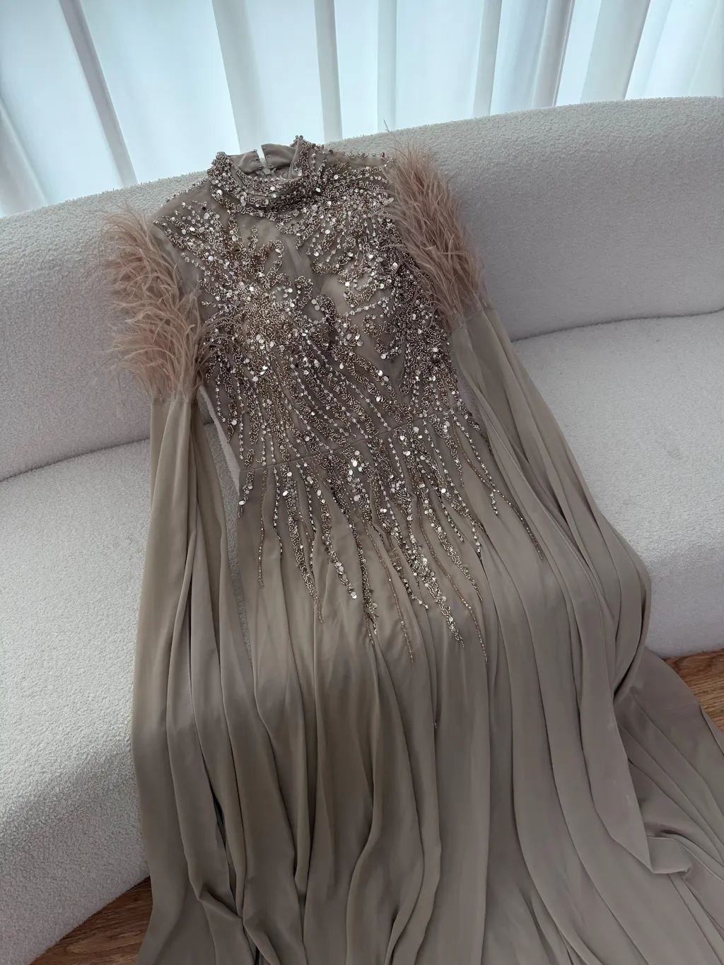 Elegant pink evening dress adorned with soft feathers, delicate beading, and flowing cape sleeves—available in 2 dreamy colors, ideal for galas and formal celebrations.