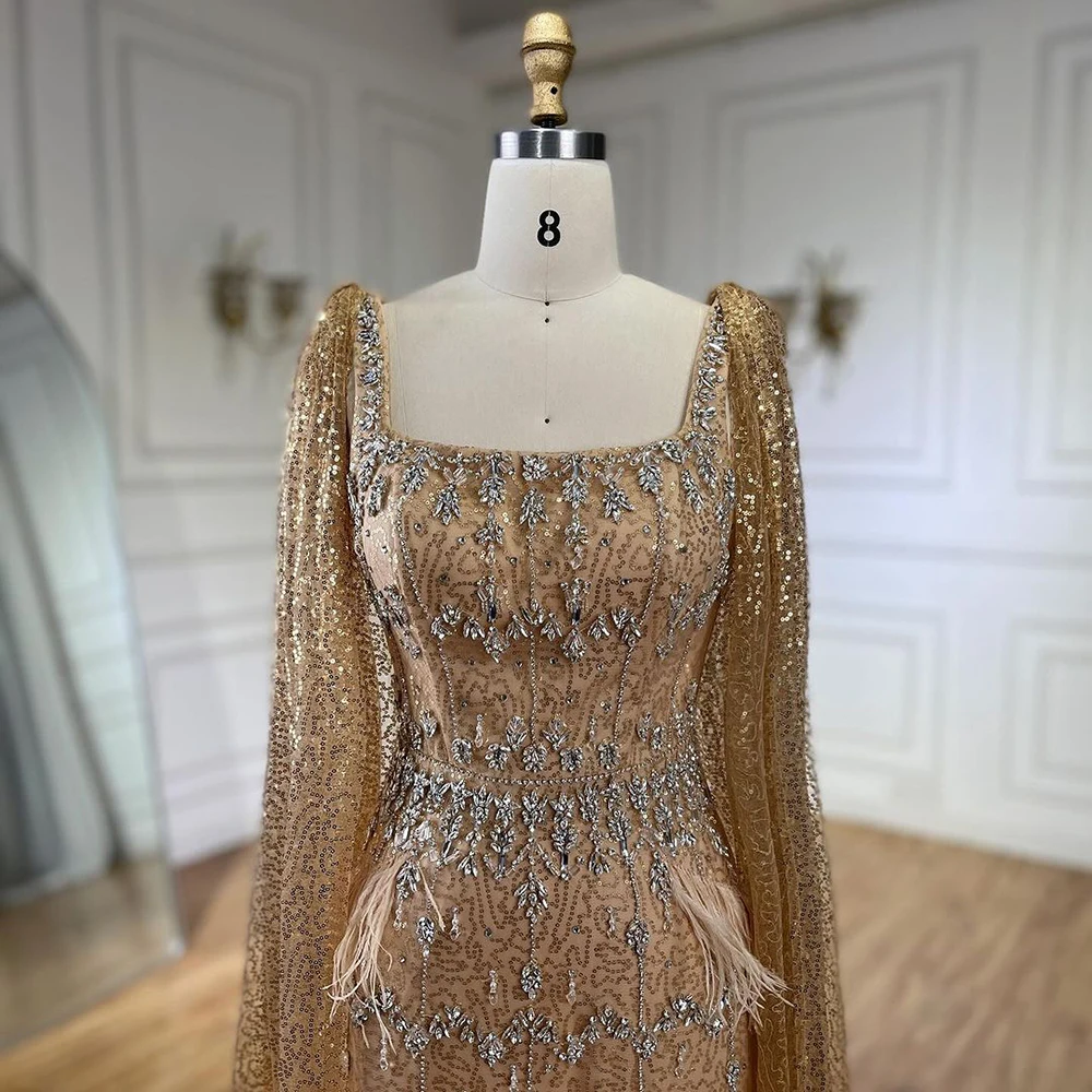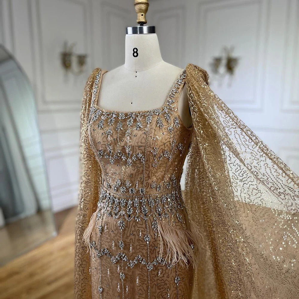 Elevate your style with our SERENE HILL Bling Gray Mermaid Arabic Evening Dress. This luxurious gown features a stunning cape adorned with feathers, perfect for adding a touch of glamour to any formal event. The chic gray color and mermaid silhouette will make you stand out from the crowd. Perfect for weddings, parties, and any special occasion.
