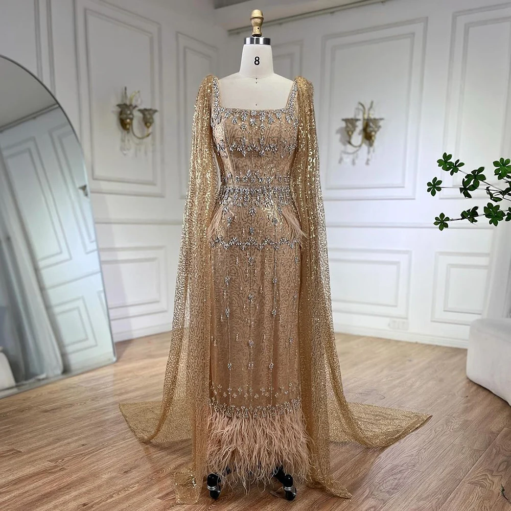 Bling Gray Mermaid Feather Arabic Midi Evening Dress with Cape LA72334