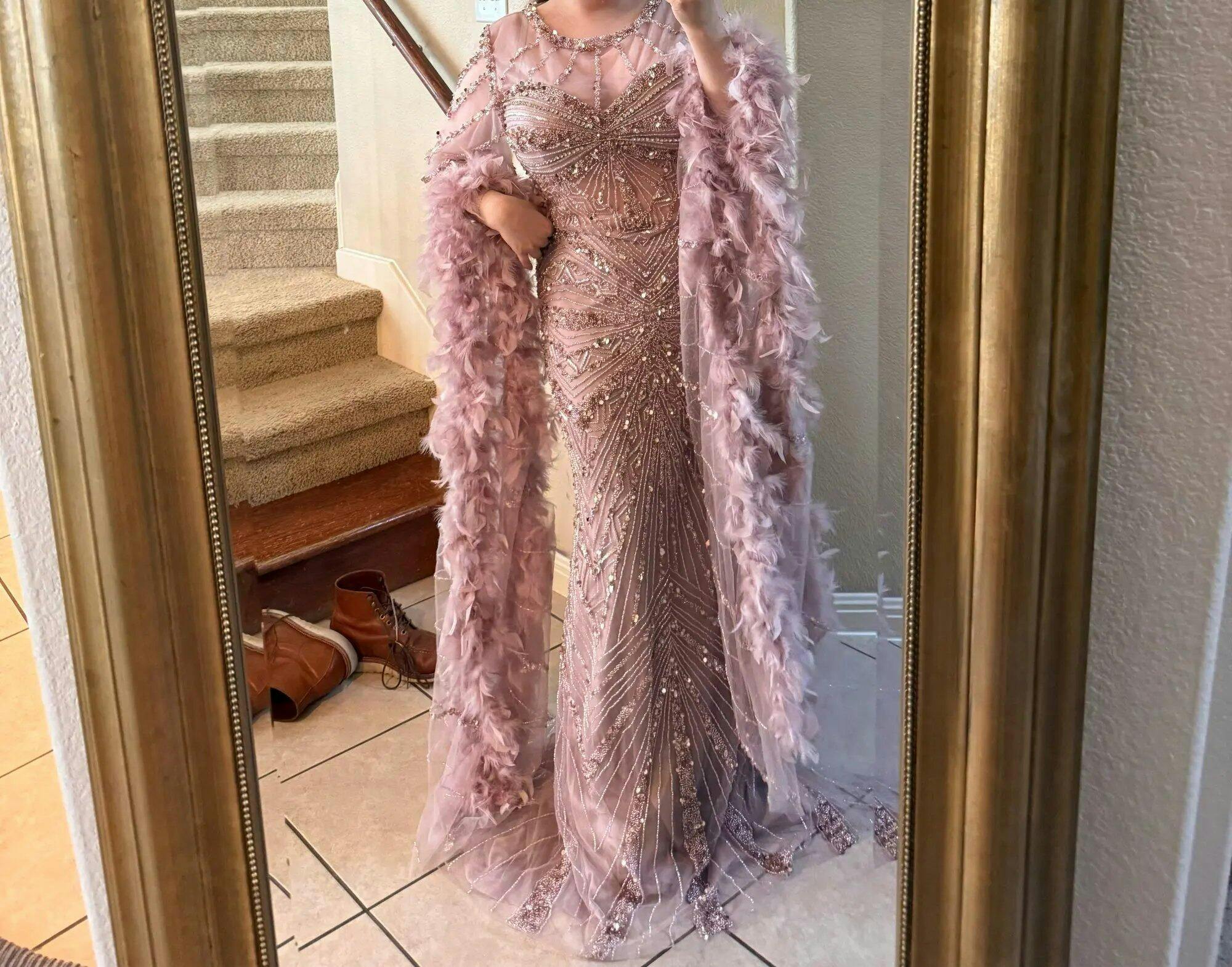 Luxury Modest Caramel Feather Long Cape Sleeves Mermaid Evening Dress LA72708A