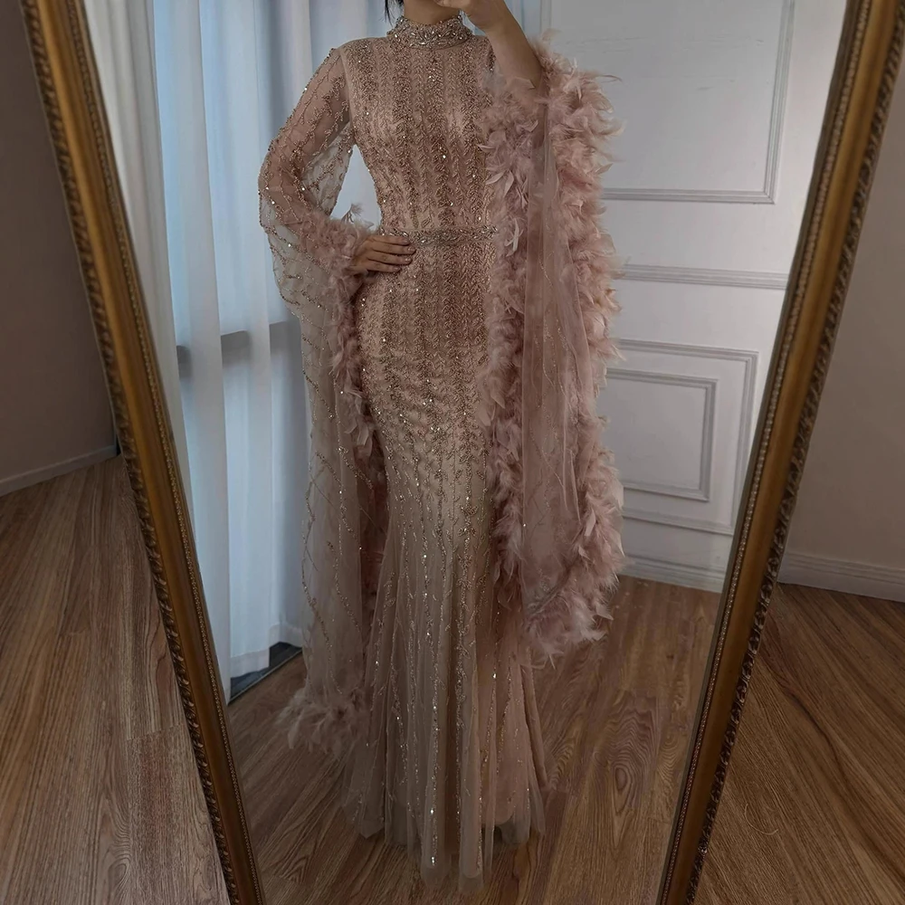 Elegant Rose Gold Evening Dress Featuring Feathered Cape Sleeves LA72947