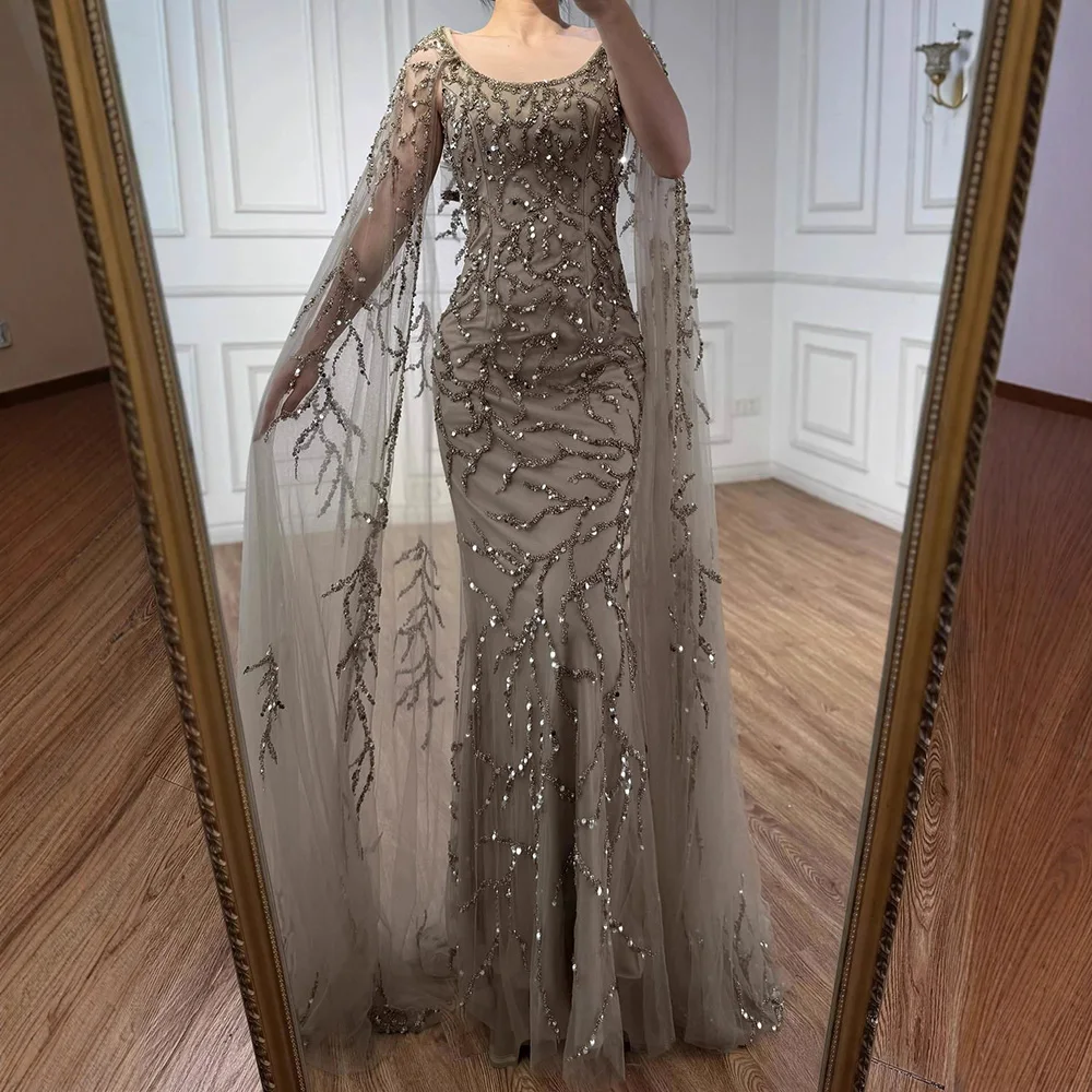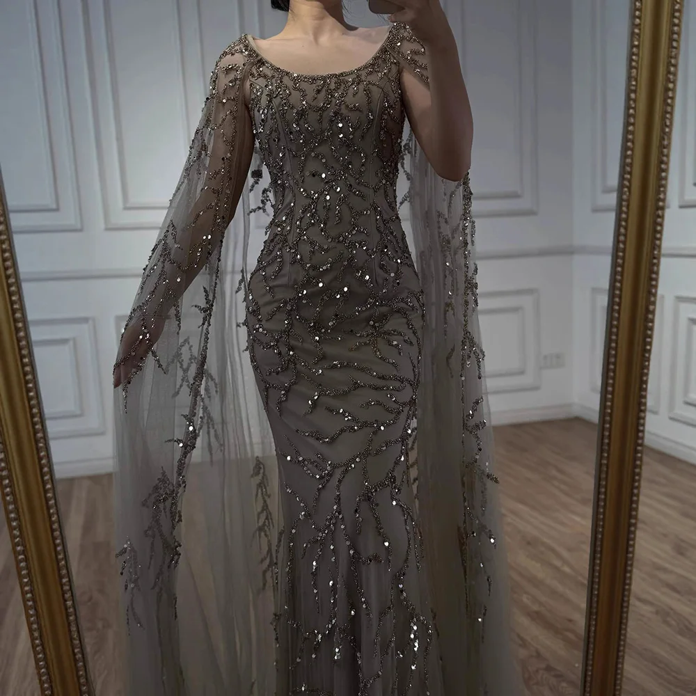 Graceful gray mermaid evening dress with cape sleeves, adorned with intricate beading for a refined look. Available in two elegant colors to suit your style.