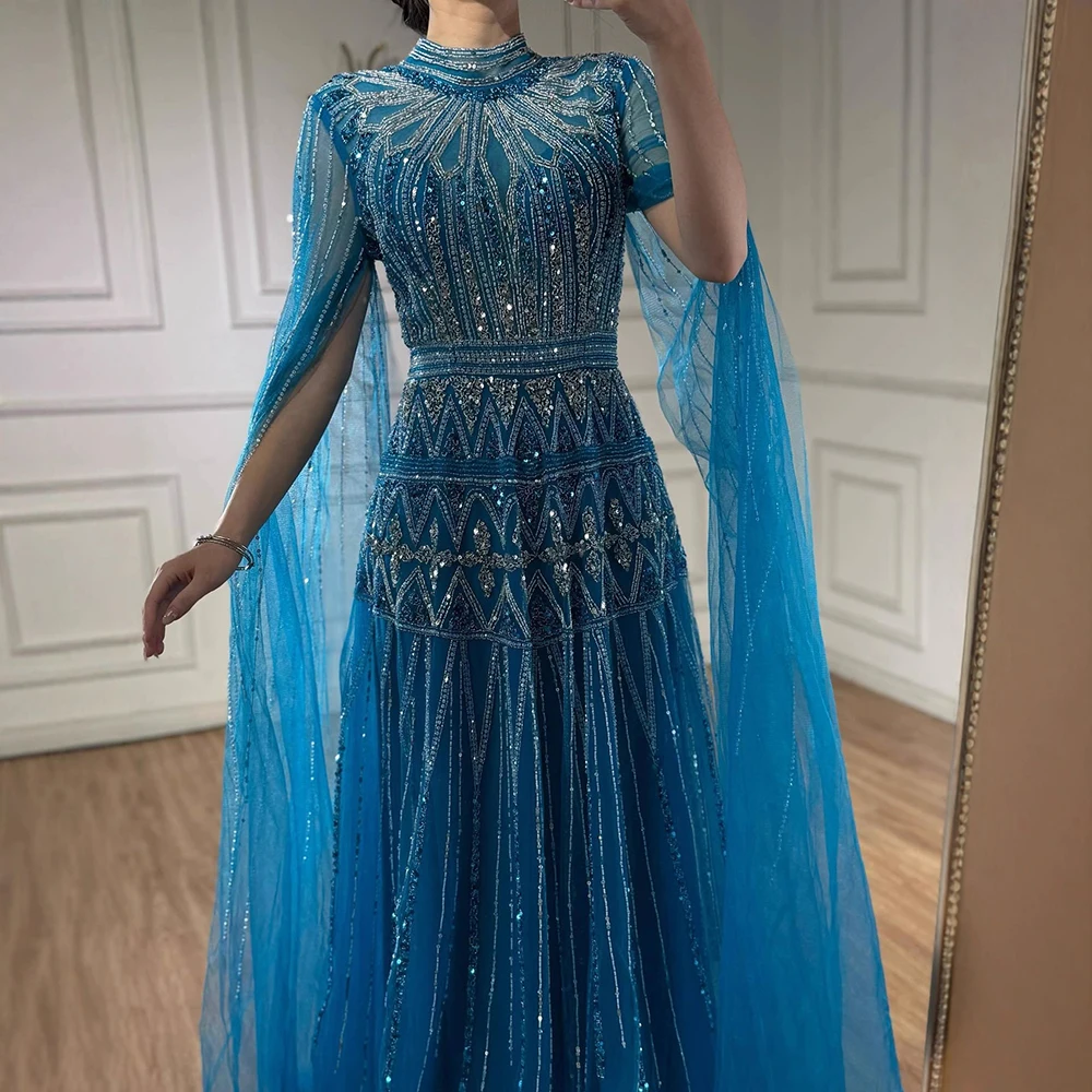 Luxury Arabic Blue Beaded Evening Dress with Cape Sleeves LA73187