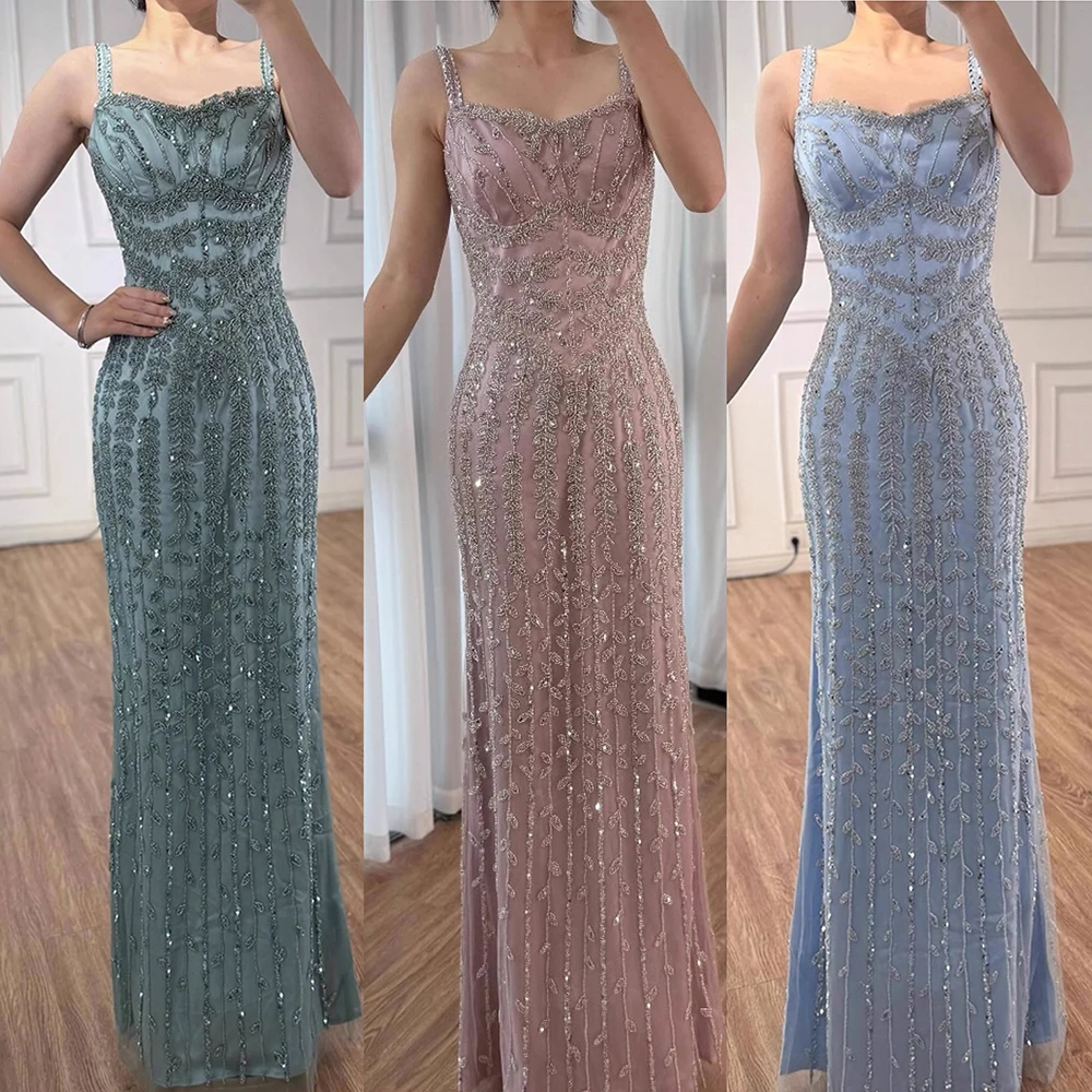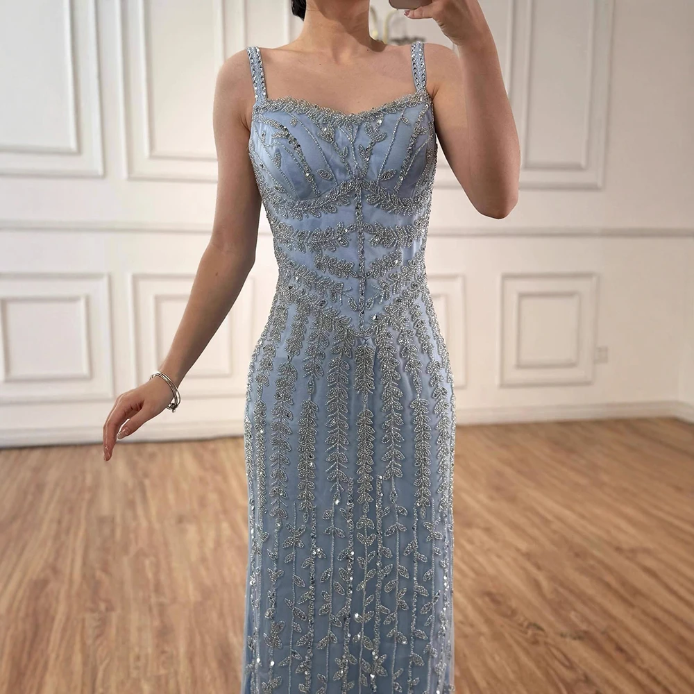 Luxury Arabic Blue Spaghetti Strap Mermaid Evening Dress Beaded LA72725