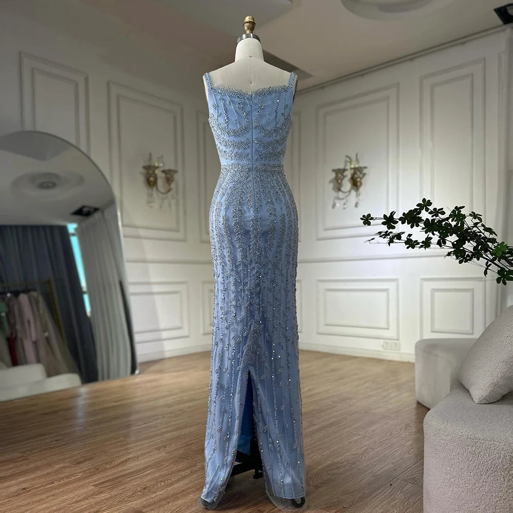 Elegant Arabic-style blue mermaid evening dress with spaghetti straps and luxury beadwork. Perfect for formal occasions or Saudi events. Model LA72725.
