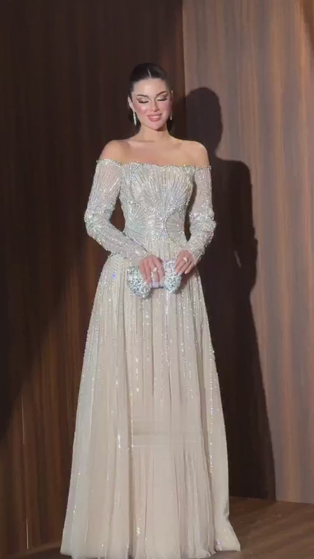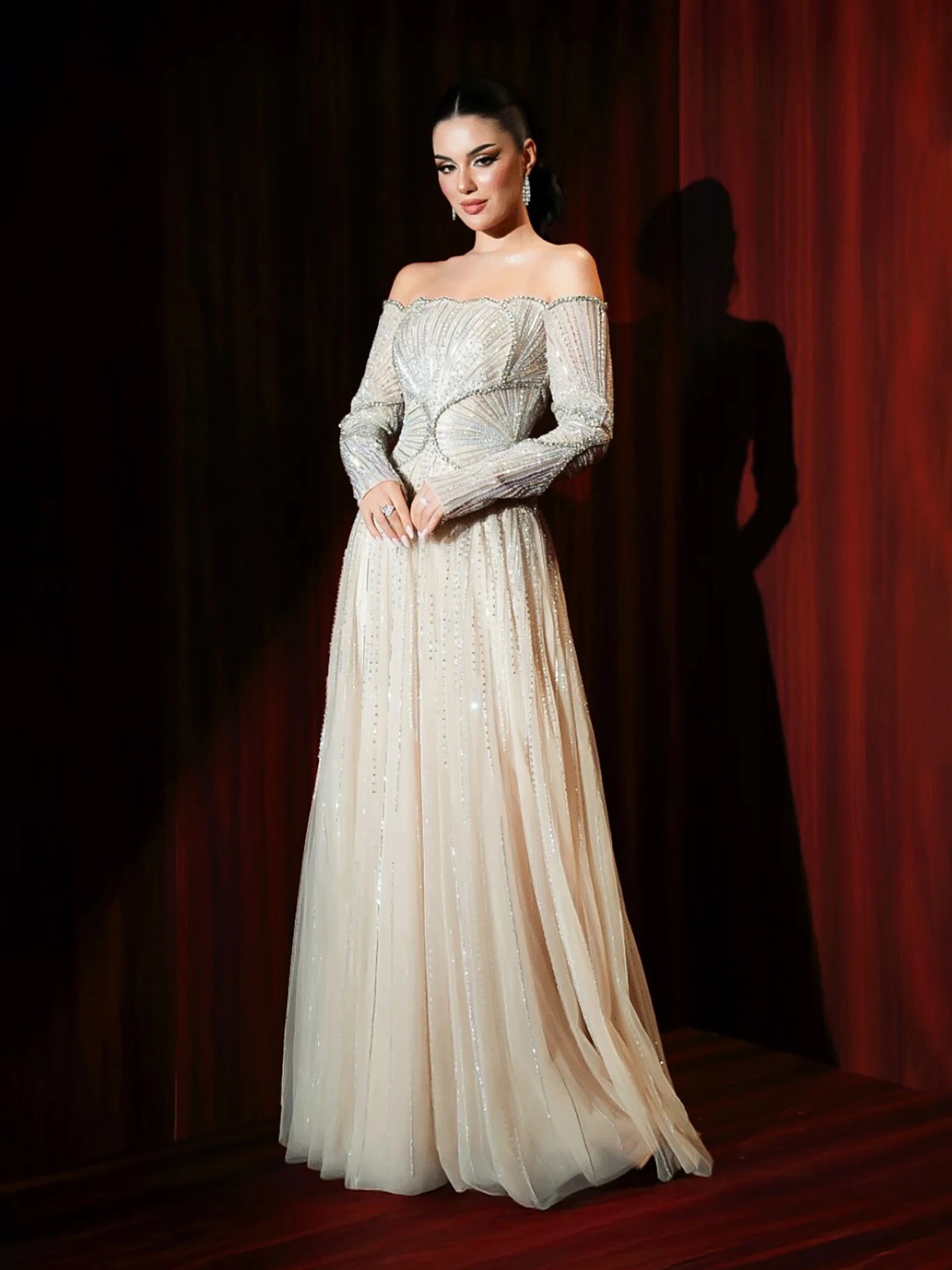 A Luxury Beige Arabic Dubai Famous Designer A-Line Evening Dress Designed For Wedding Parties And Formal Occasions. Model LA73333.