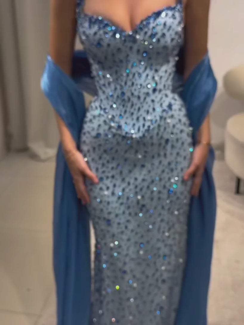 Luxury Blue Diamond Halter Evening Dress With Cape LA73471