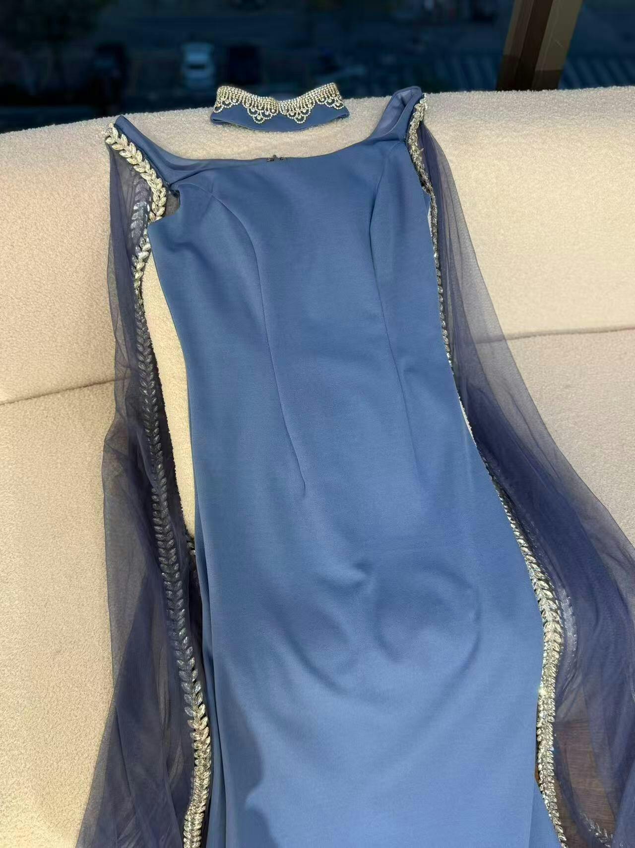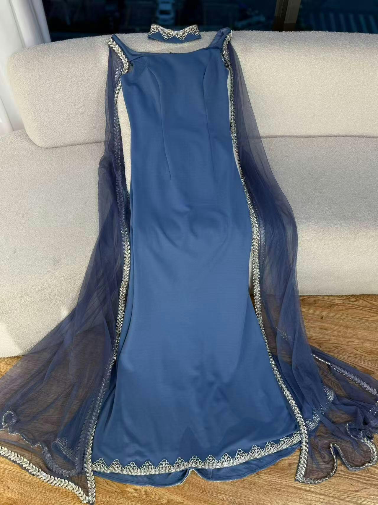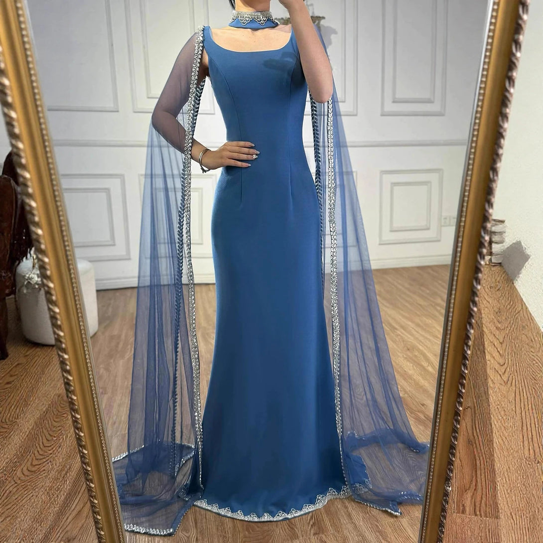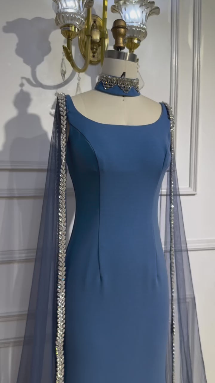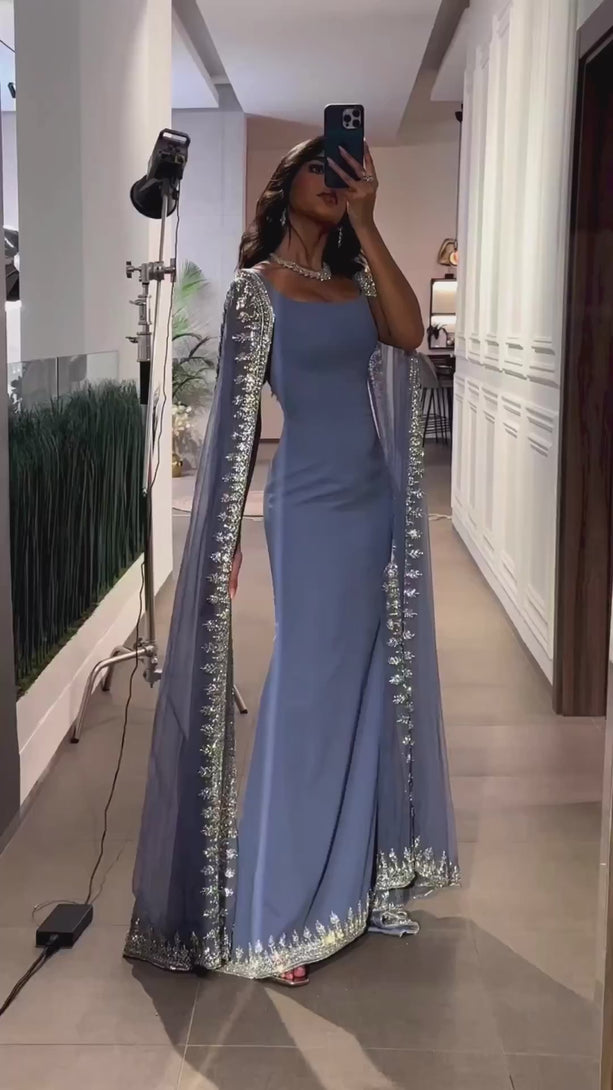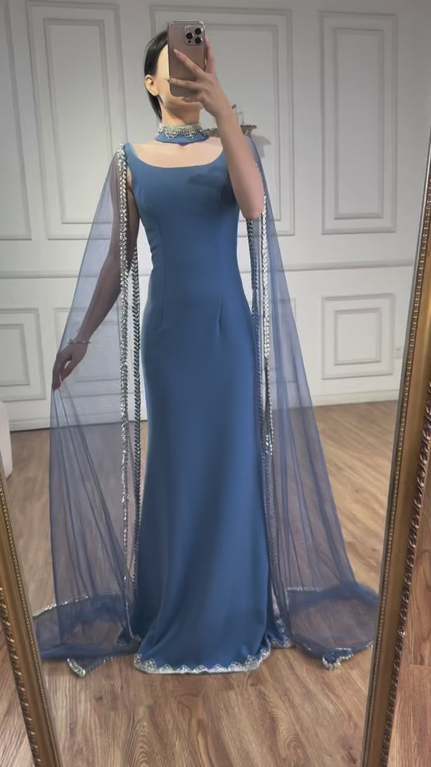 Elegant blue mermaid evening dress featuring sparkling beadwork and flowing cape sleeves, perfect for formal events, parties, and special occasions.
