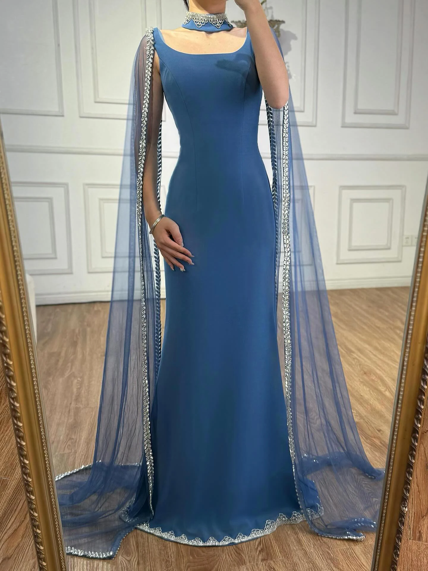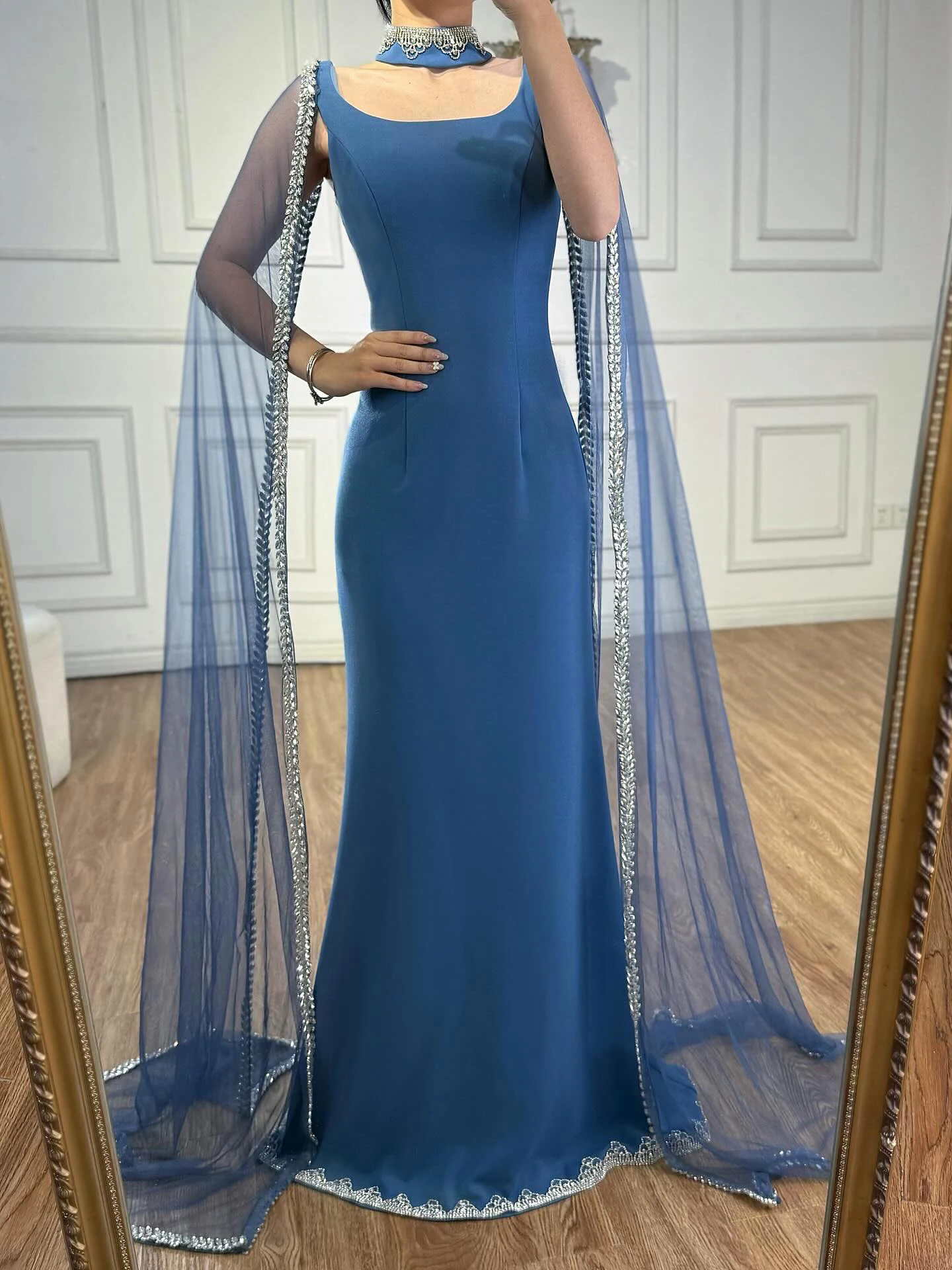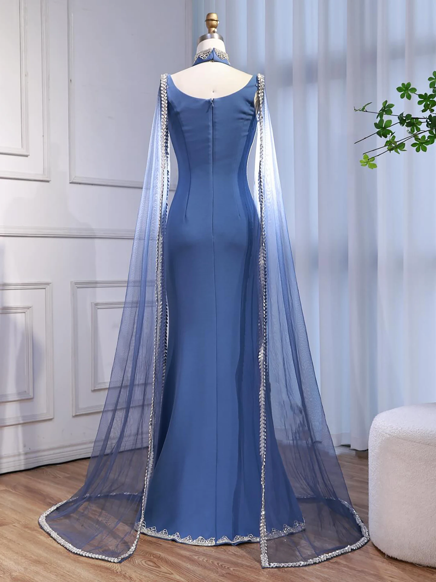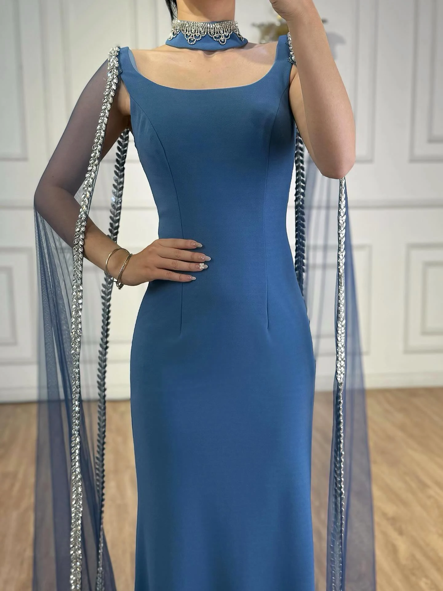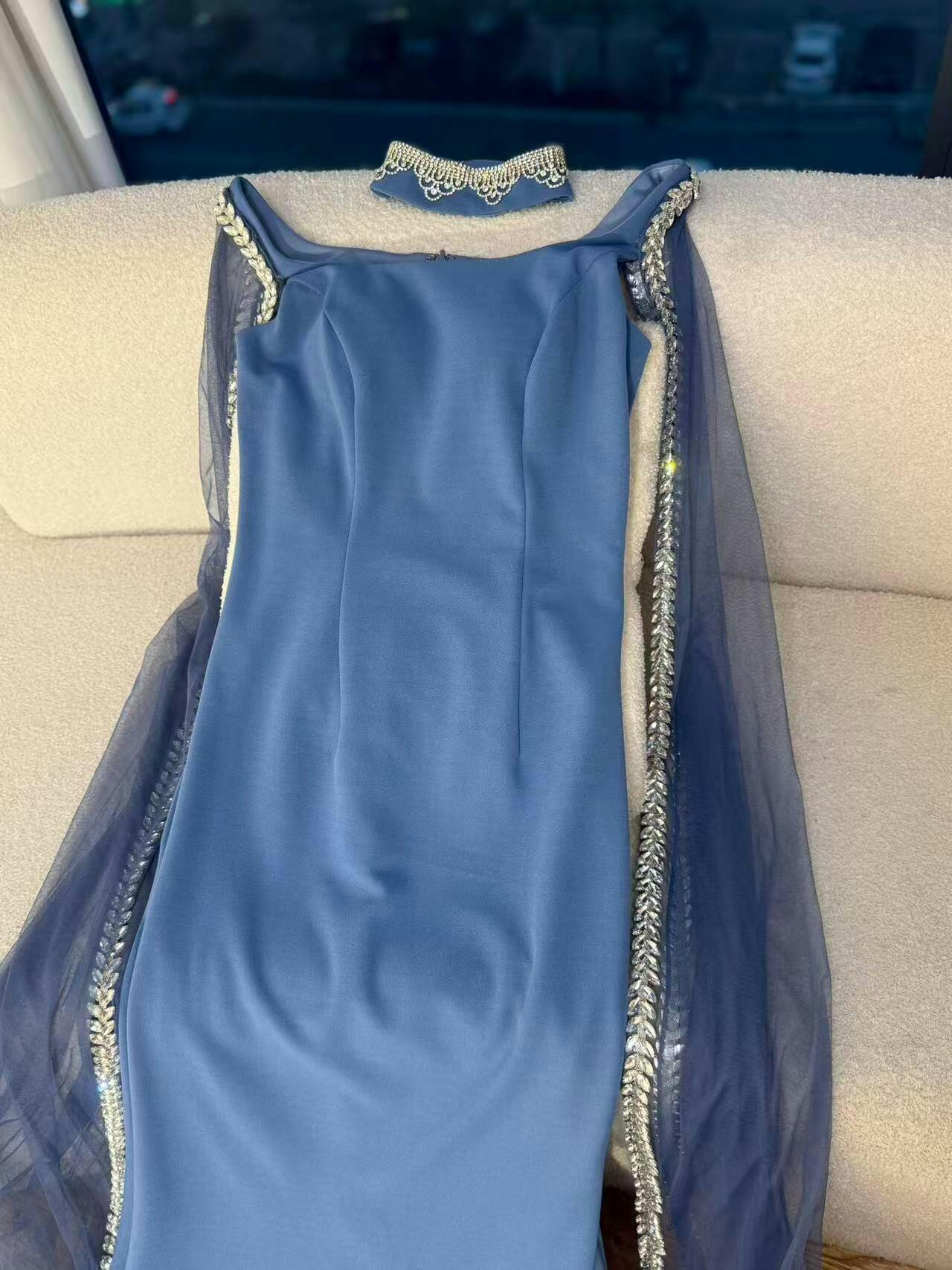 Elegant blue mermaid evening dress featuring sparkling beadwork and flowing cape sleeves, perfect for formal events, parties, and special occasions.