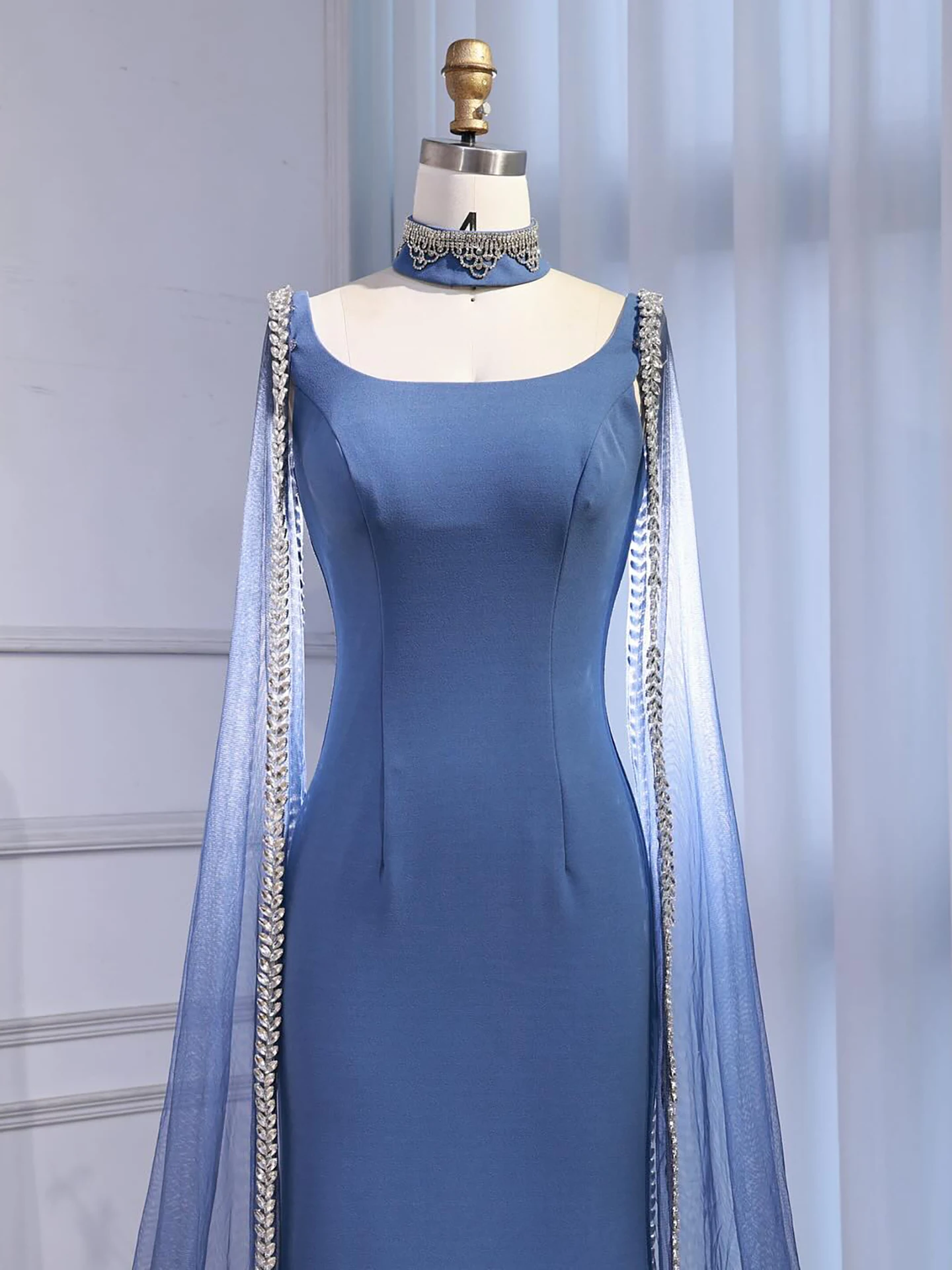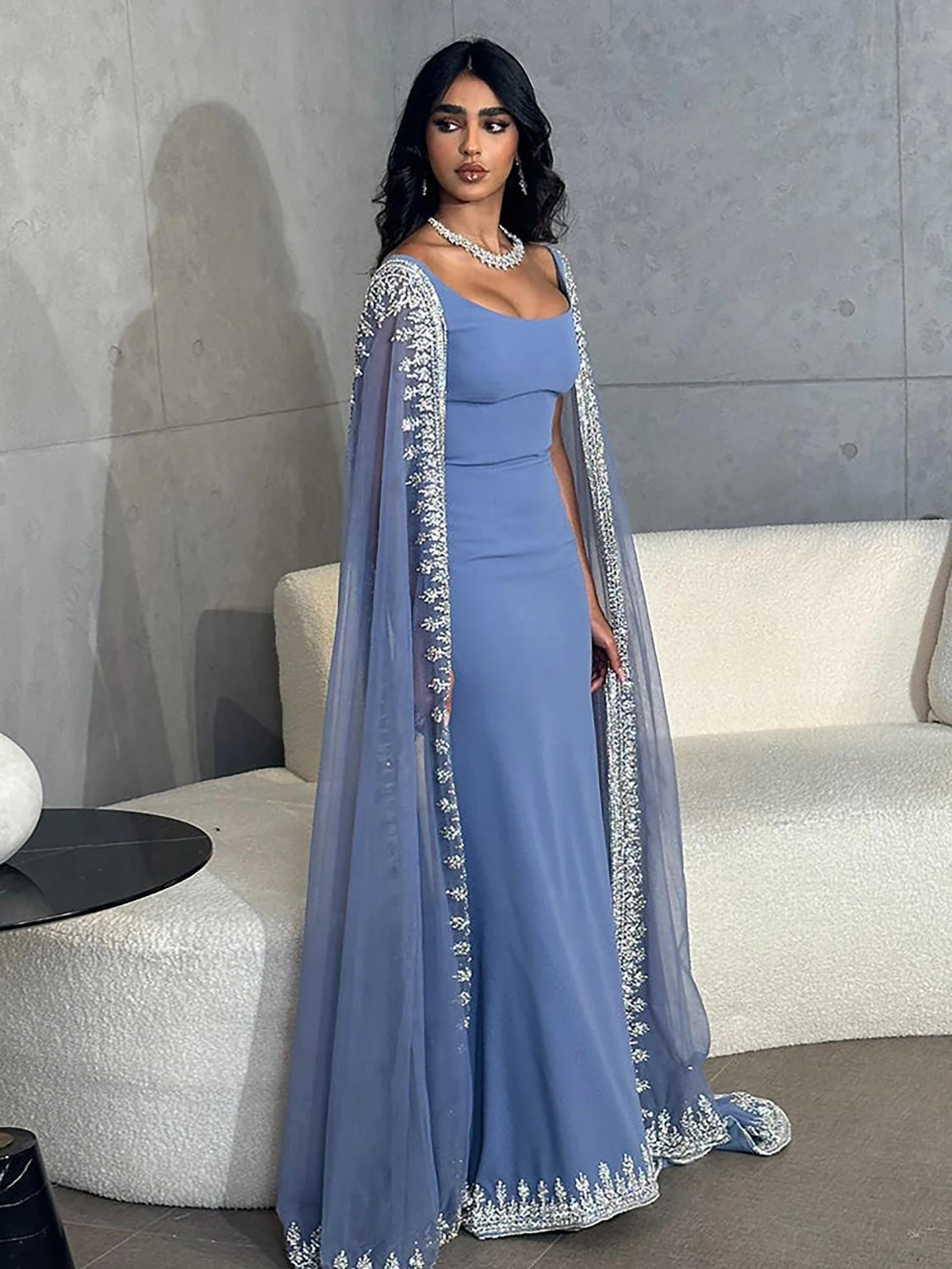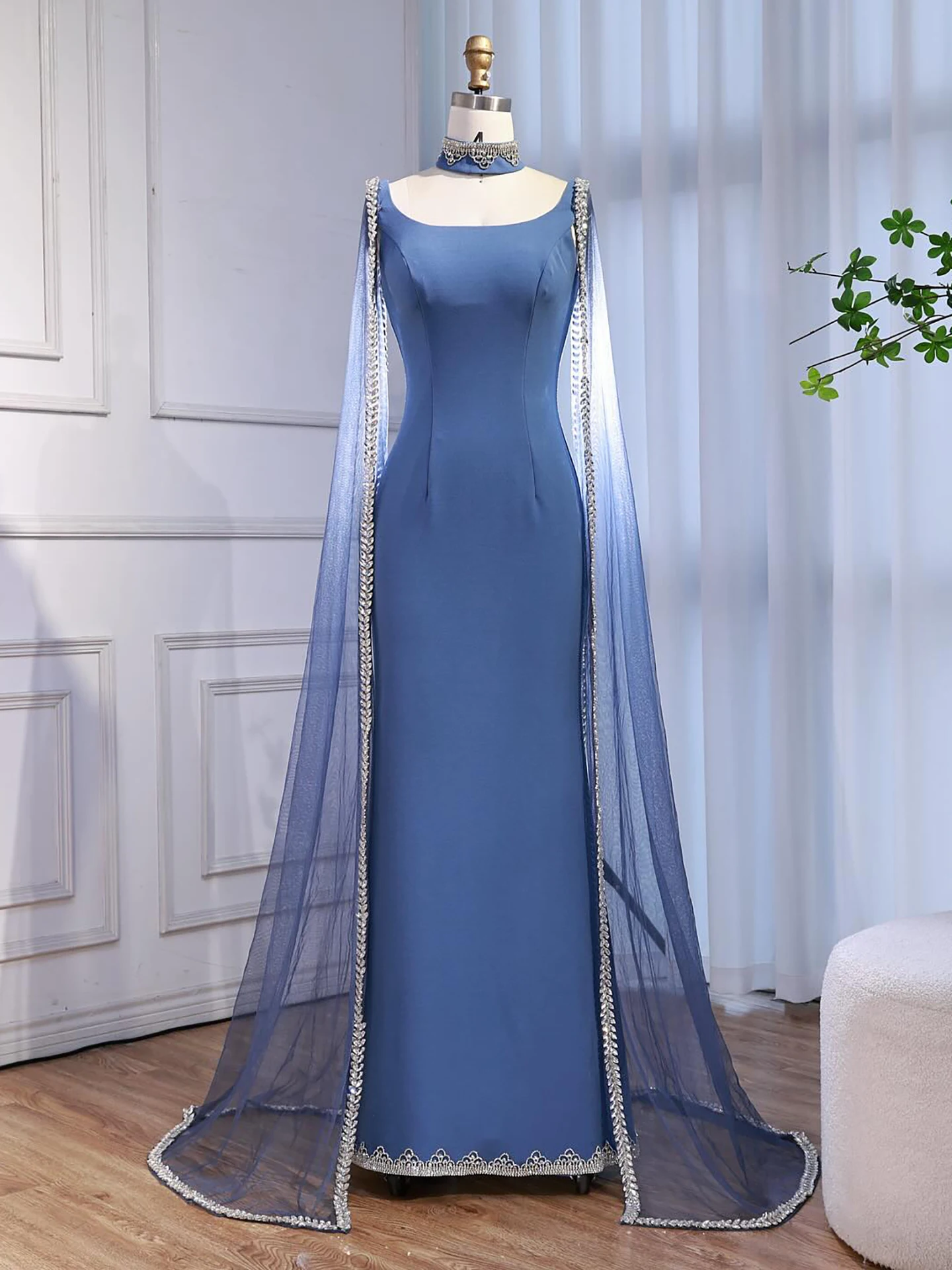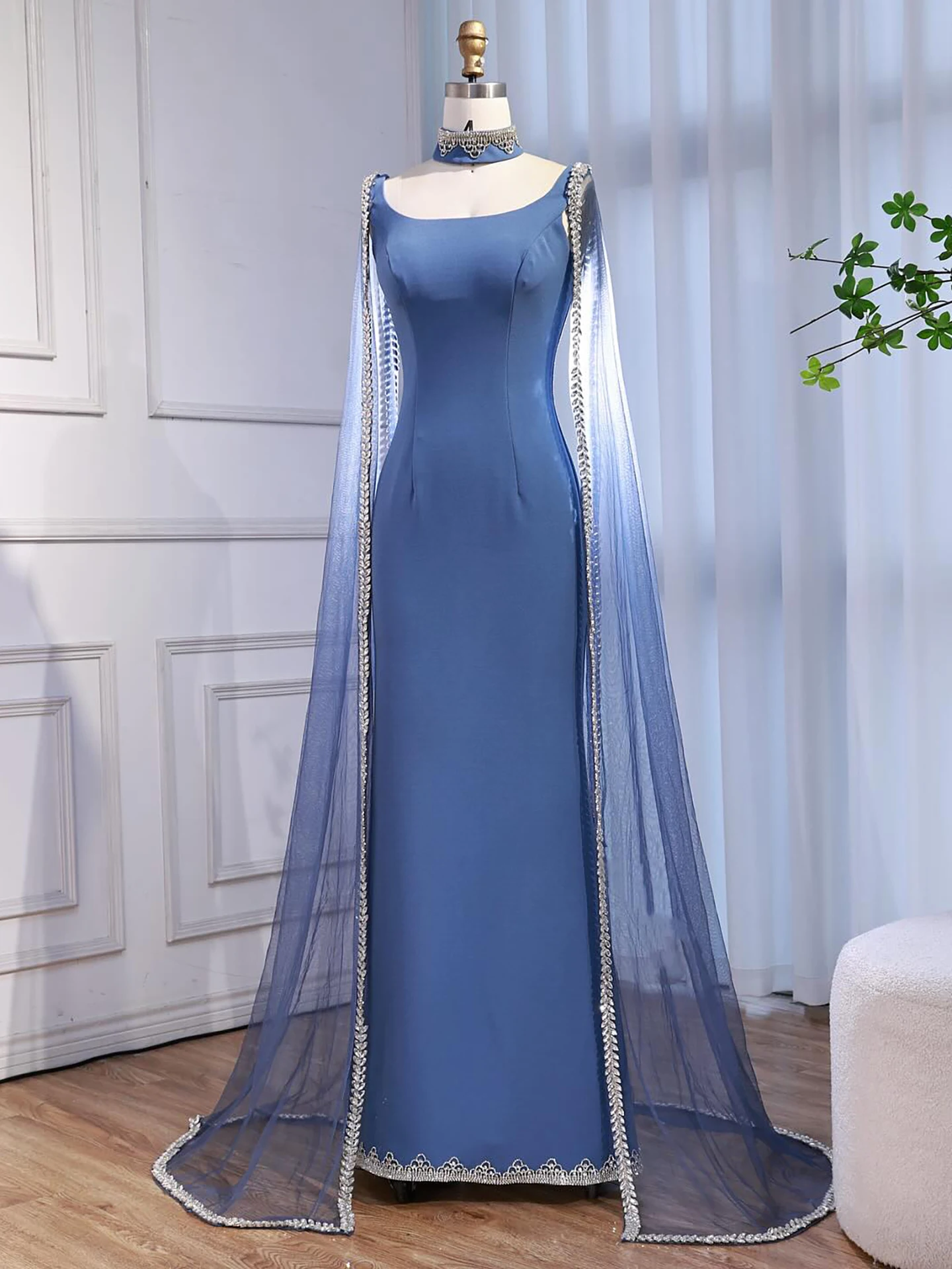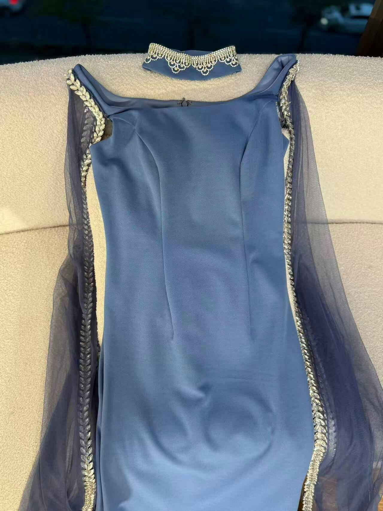 Elegant blue mermaid evening dress featuring sparkling beadwork and flowing cape sleeves, perfect for formal events, parties, and special occasions.