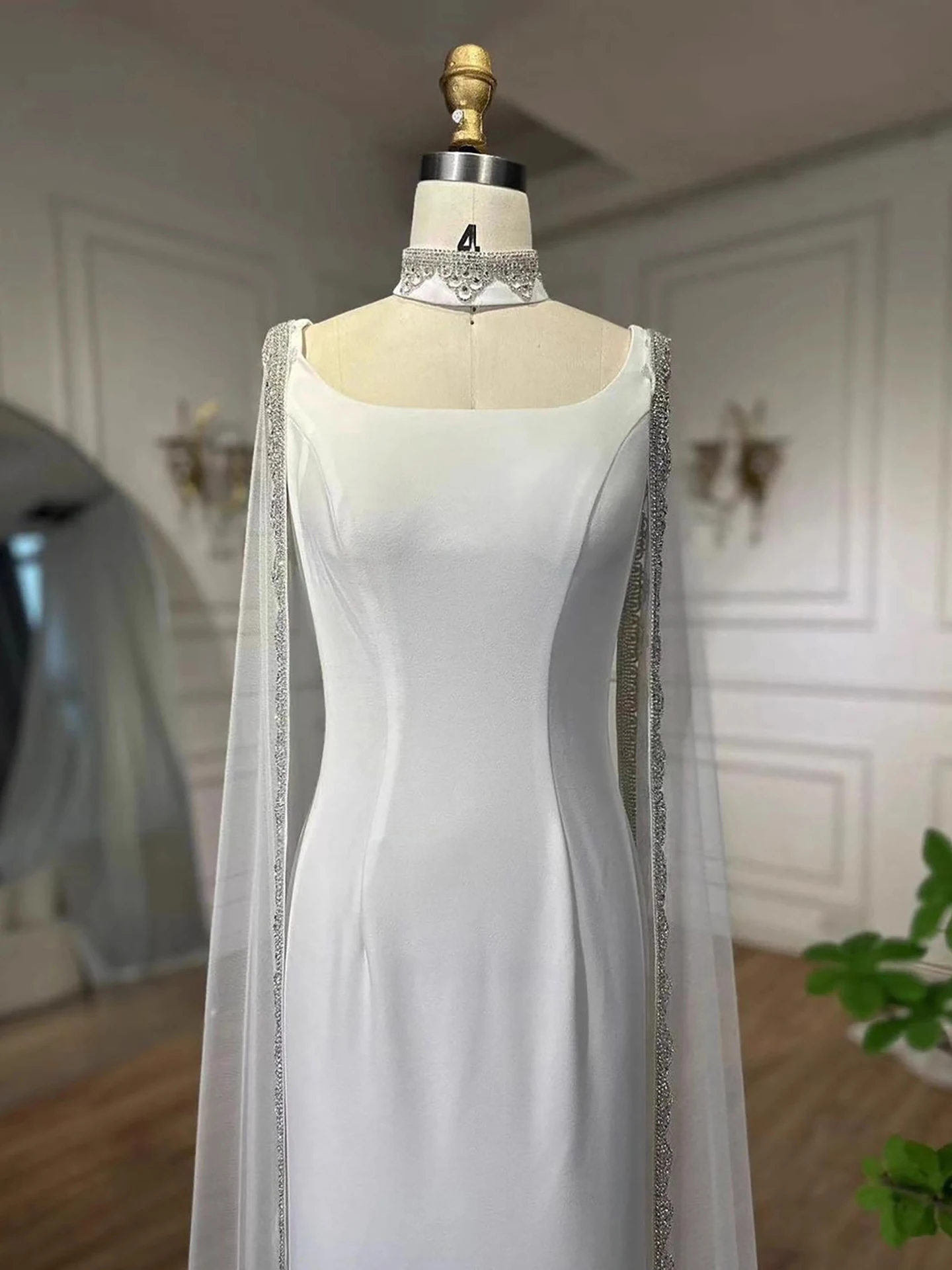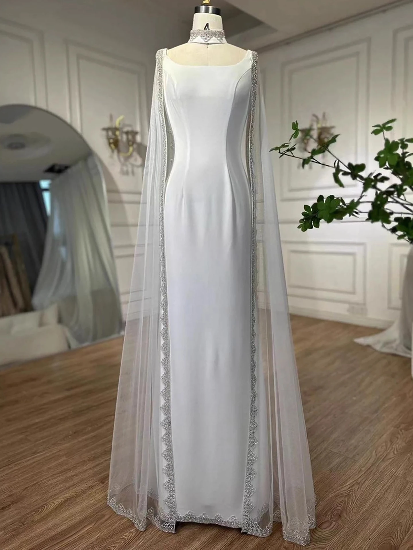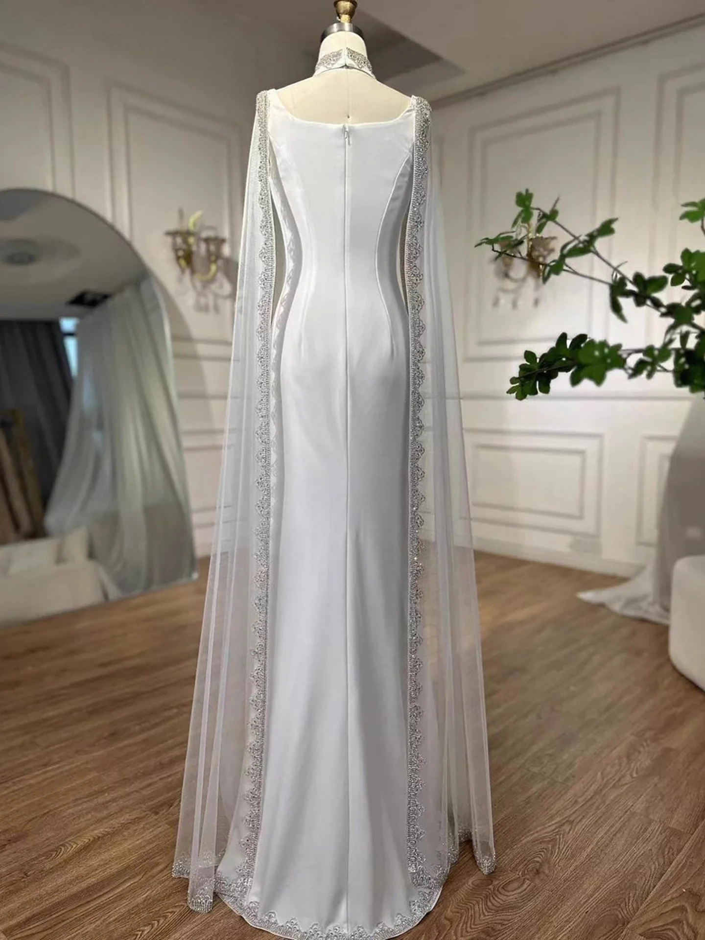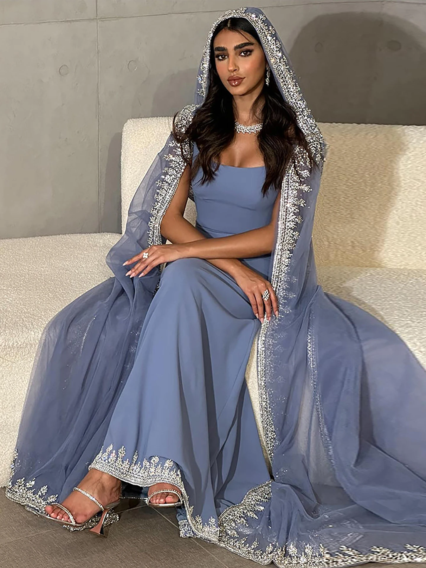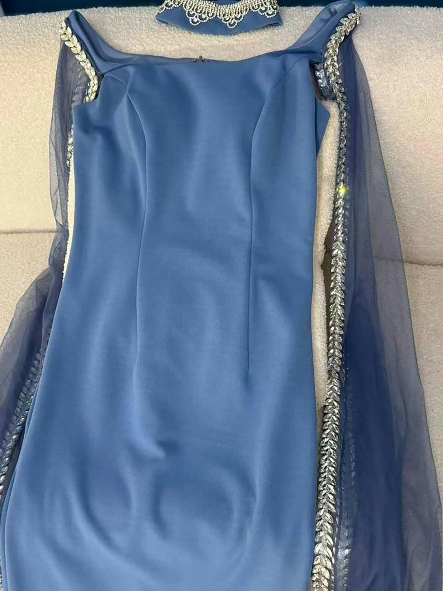 Elegant blue mermaid evening dress featuring sparkling beadwork and flowing cape sleeves, perfect for formal events, parties, and special occasions.