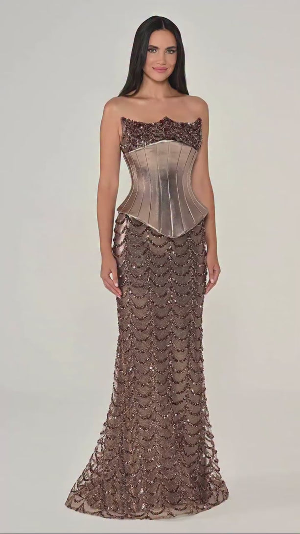 Luxury coffee strapless mermaid evening dress featuring a structured corset bodice and intricate beaded details. Elegant fit for formal occasions.