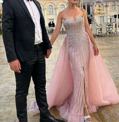 Opulent Dubai nude beaded mermaid evening dress with a detachable overskirt and elegant detailing—available in two refined color options, ideal for formal occasions.