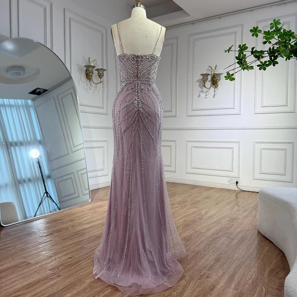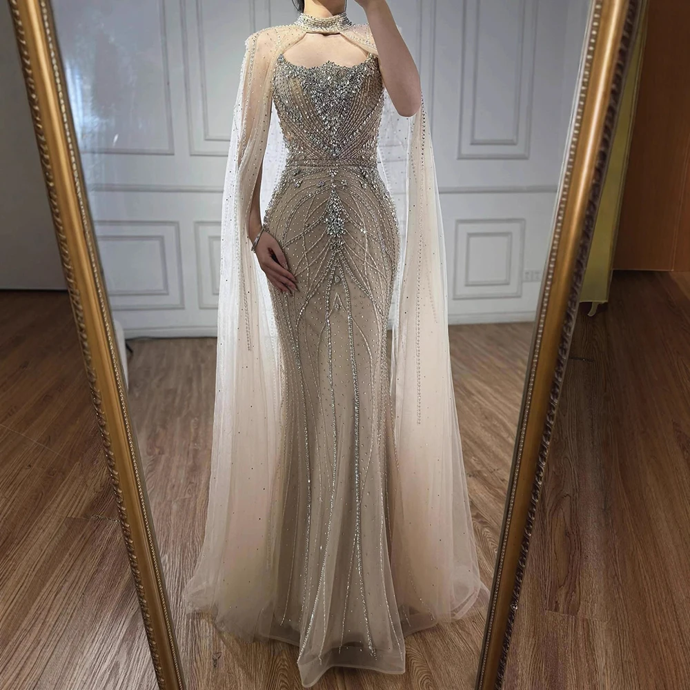 Elegant nude mermaid evening dress LA73195 featuring Dubai-inspired cape sleeves and fine beadwork, ideal for weddings and formal parties.