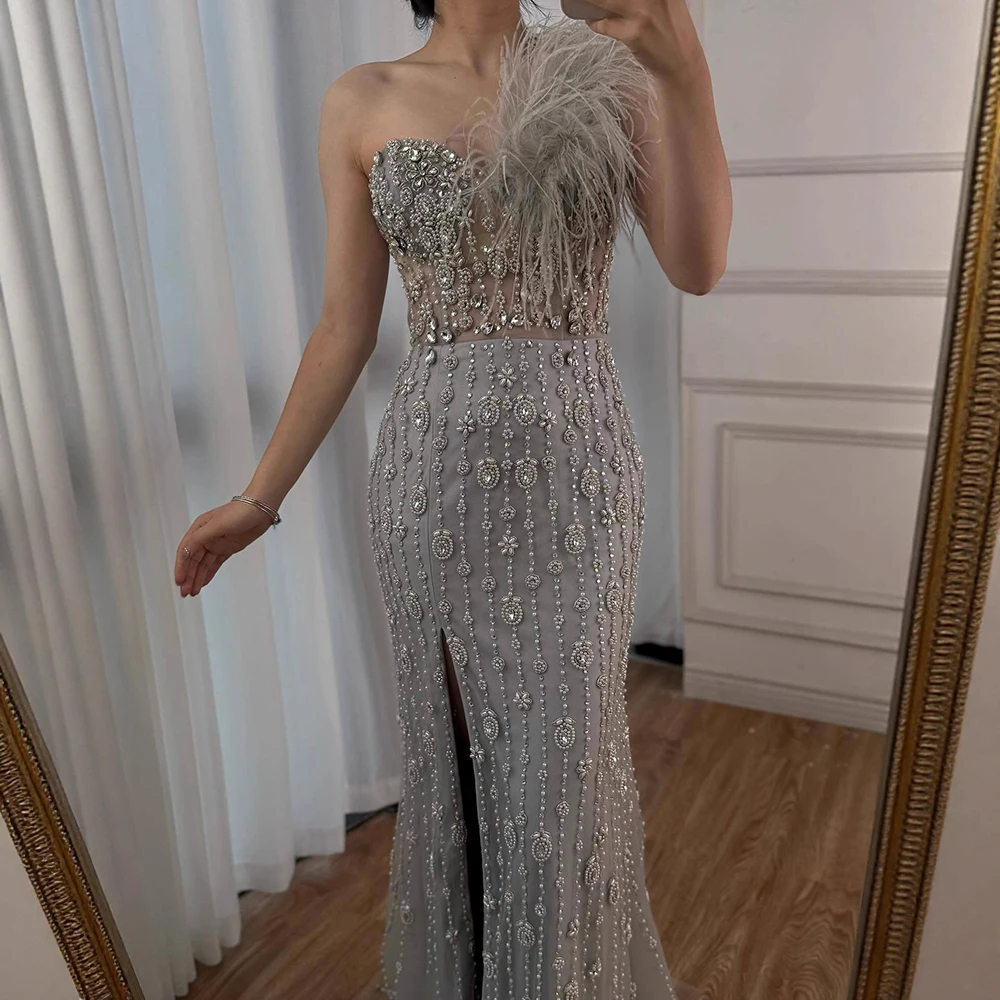 Elegant luxury gray mermaid evening gown with one shoulder design, high split, beaded details, and feather embellishments, perfect for parties and formal events.