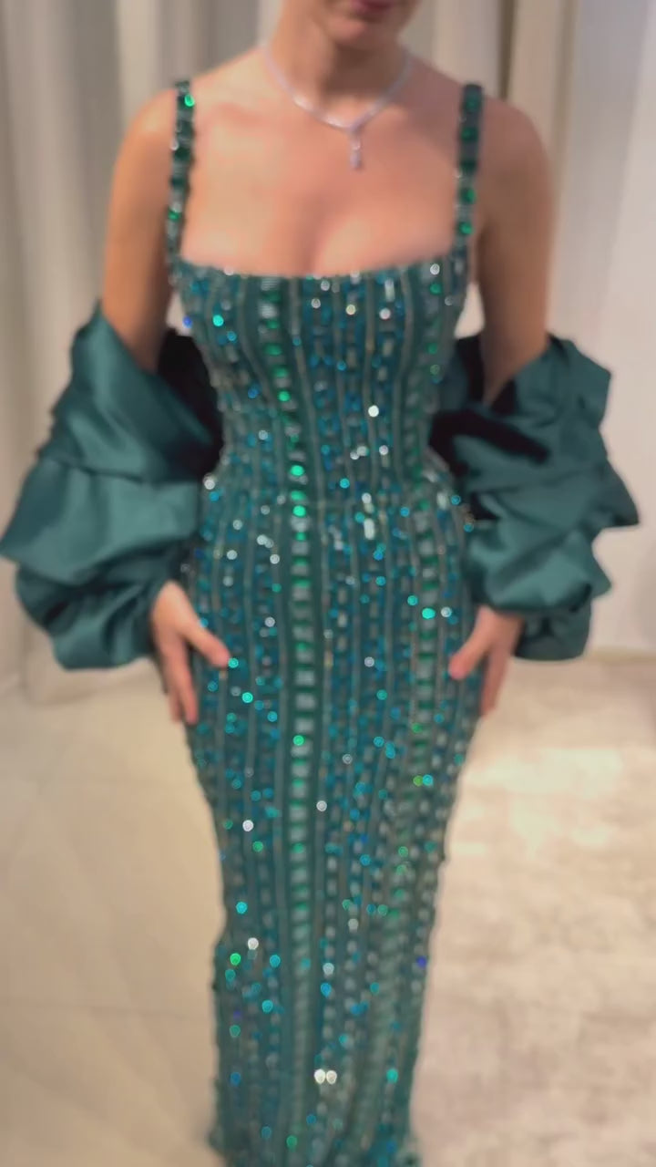 Stunning Kosovo green square-beaded evening dress with an elegant cape, perfect for formal parties and events. Style LA73355.