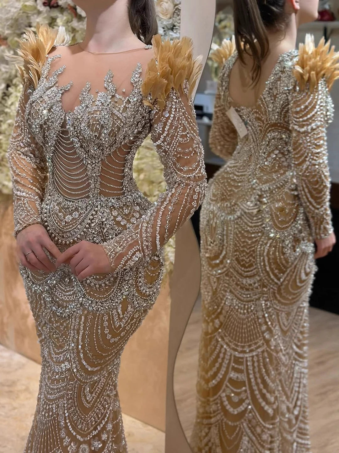 Luxury Nude Beaded Feather Long Sleeve Mermaid Evening Dress LA73348