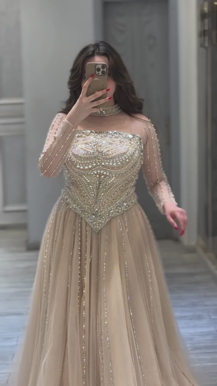 Luxury Nude Crystal Beaded A Line Long Sleeve Evening Dress LA73192