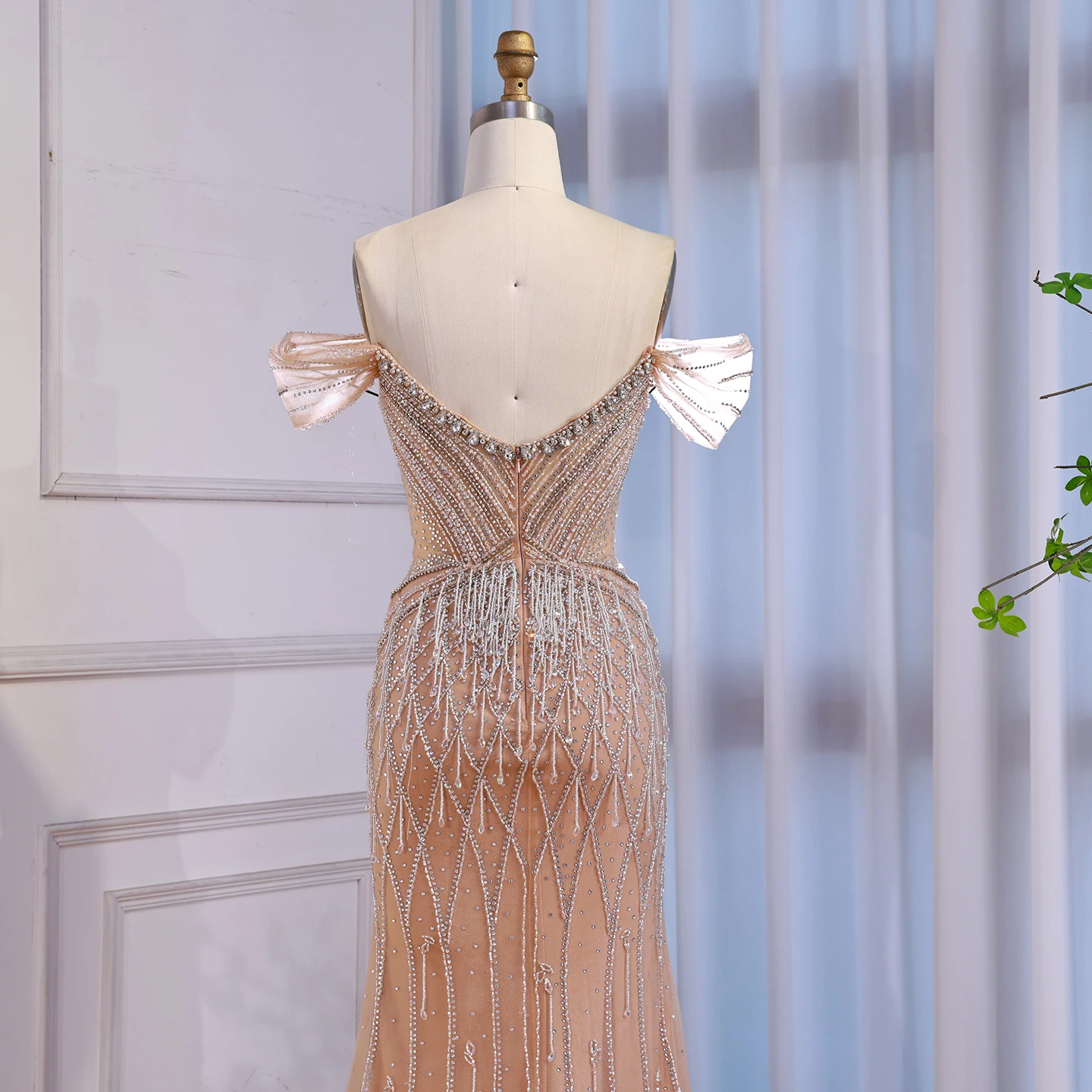 Luxury nude beaded tassel evening dress LA72854A featuring an off-shoulder Dubai-style design, perfect for formal events and wedding parties.