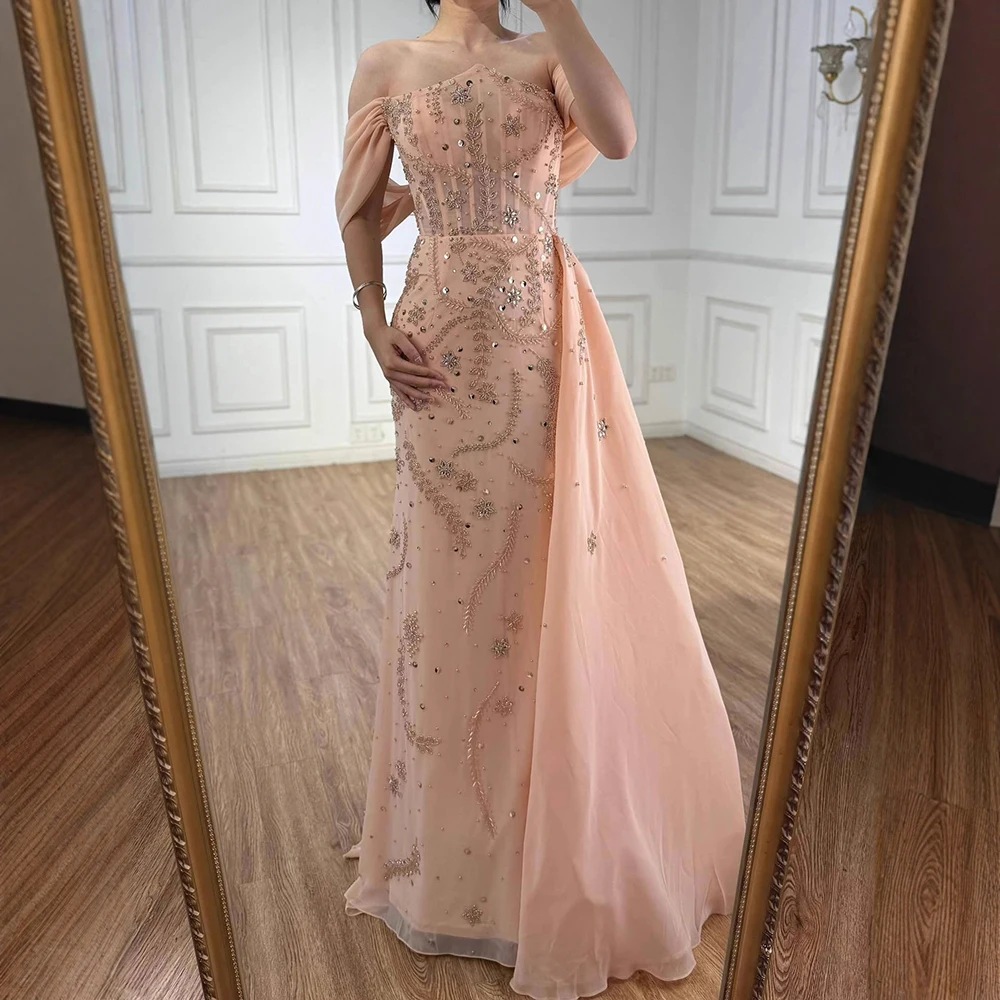Luxury Nude Off Shoulder Pearl Beaded Mermaid Evening Dress with Overskirt LA73109