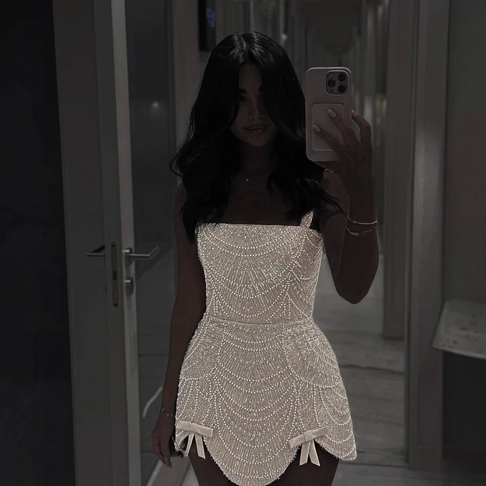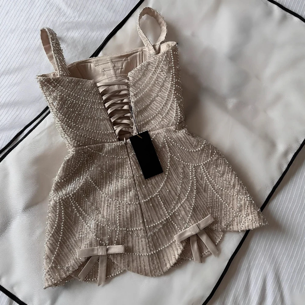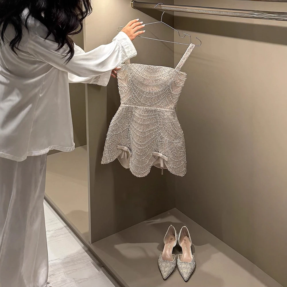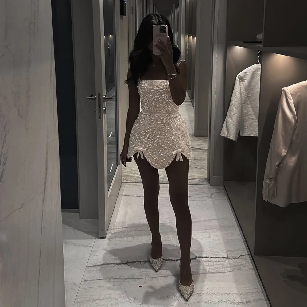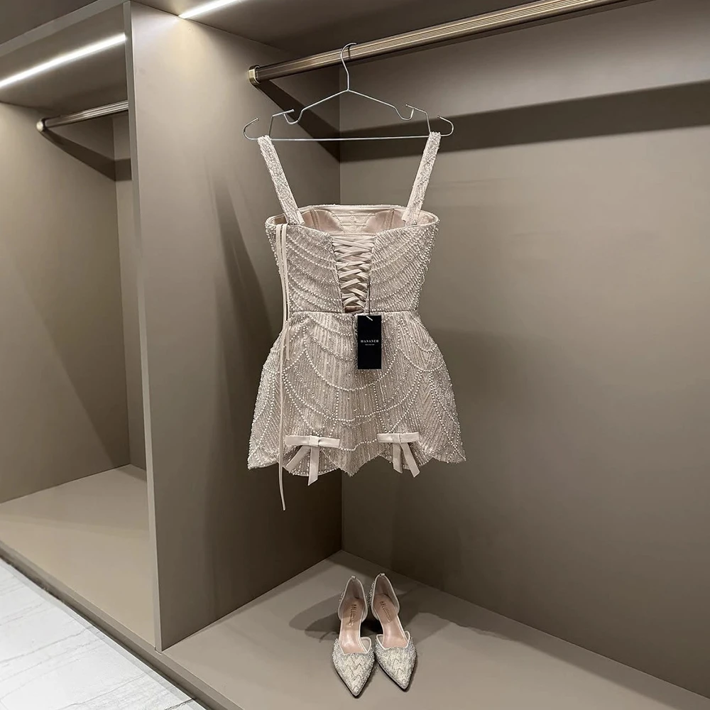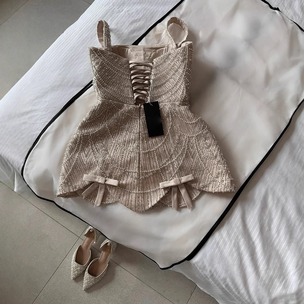 Luxury Nude Pearl Beaded A-Line Mini Evening Dress LA73211