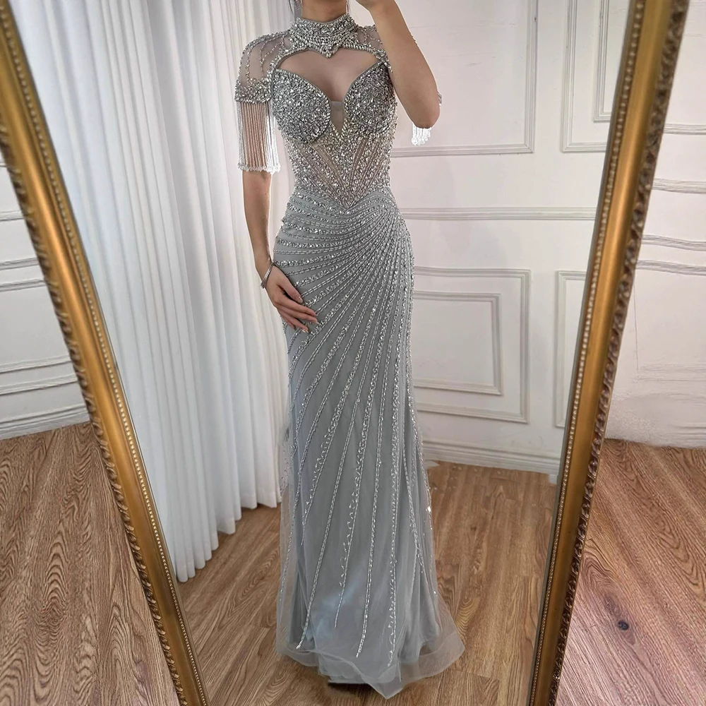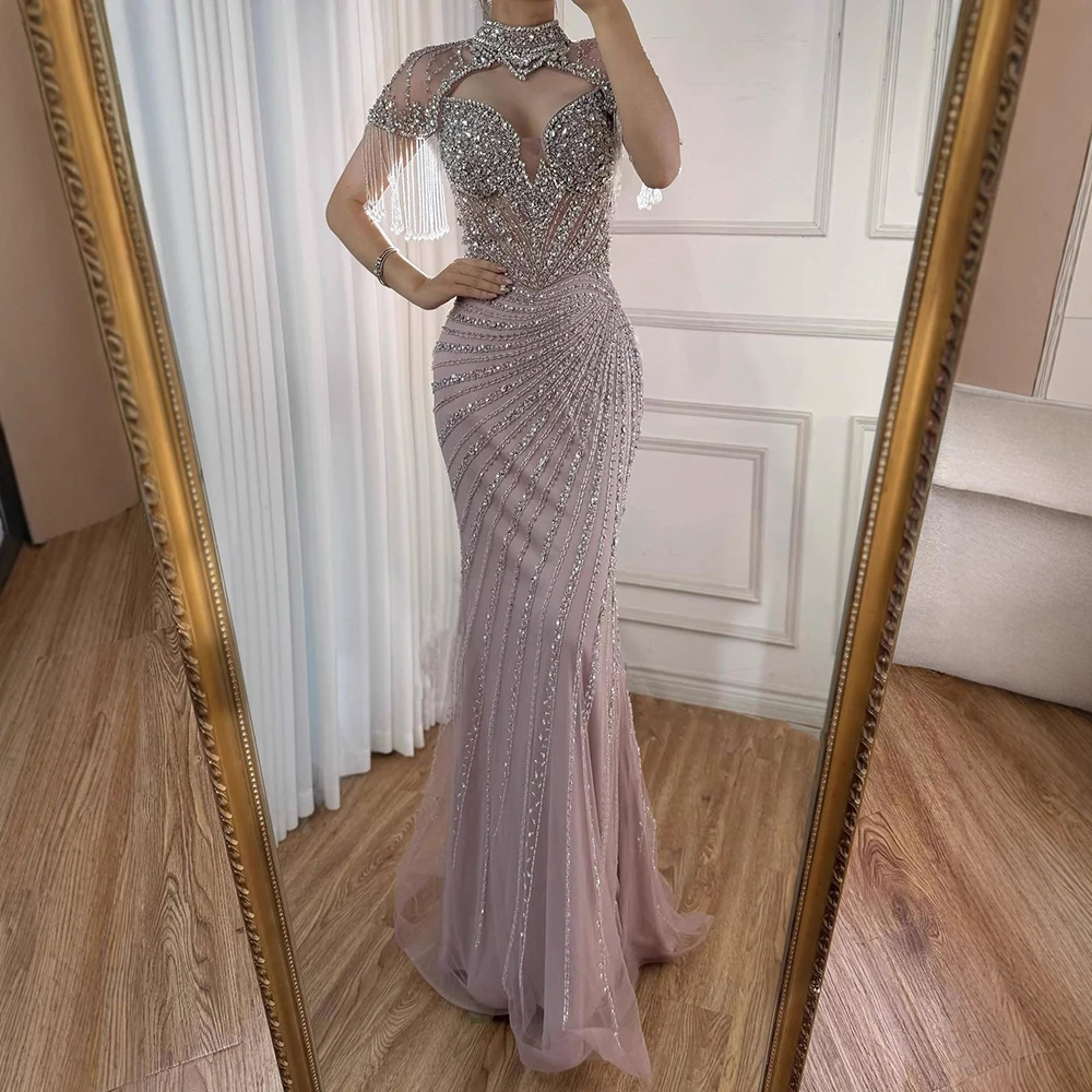 Luxury Pink Beaded Tassel Mermaid Evening Dress Long Gown LA73184