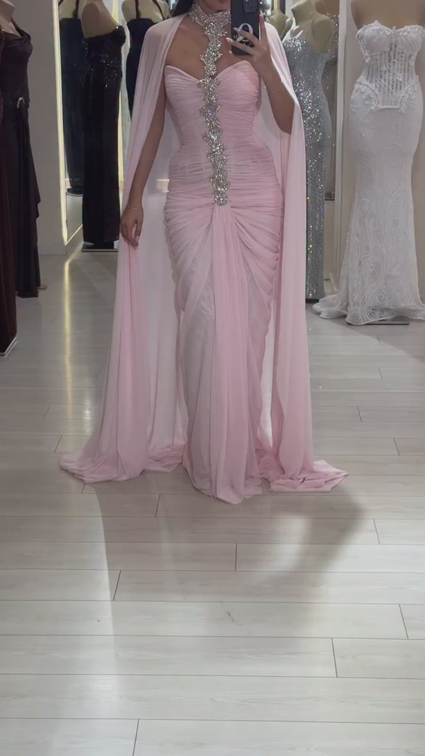 Luxury pink evening dress LA73374 featuring halter neckline, crystal beading and flowing cape, perfect for weddings, formal parties and elegant evening occasions.