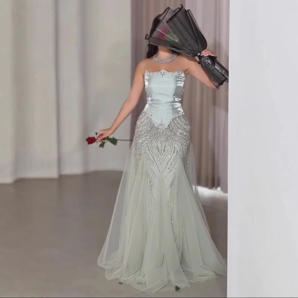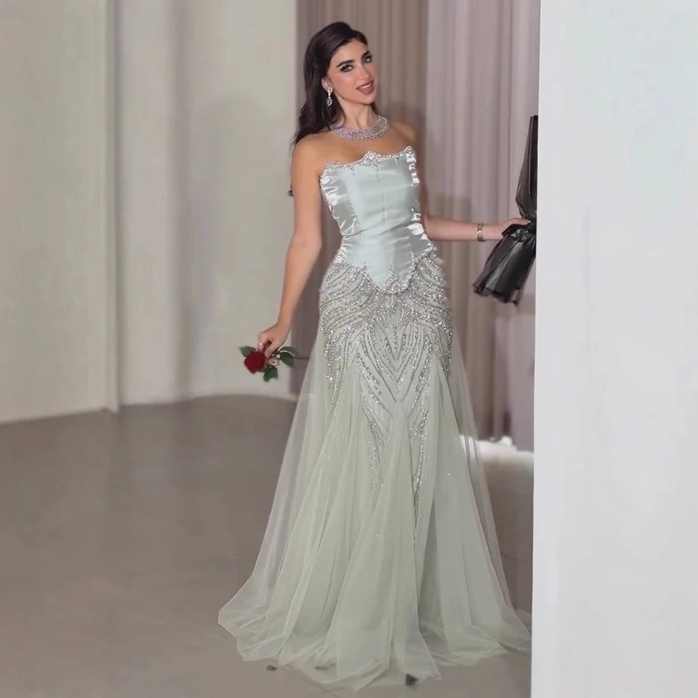 Elegant sage green satin mermaid evening dress LA73198 with balloon sleeves and intricate beadwork. Ideal for galas, weddings, or formal parties.