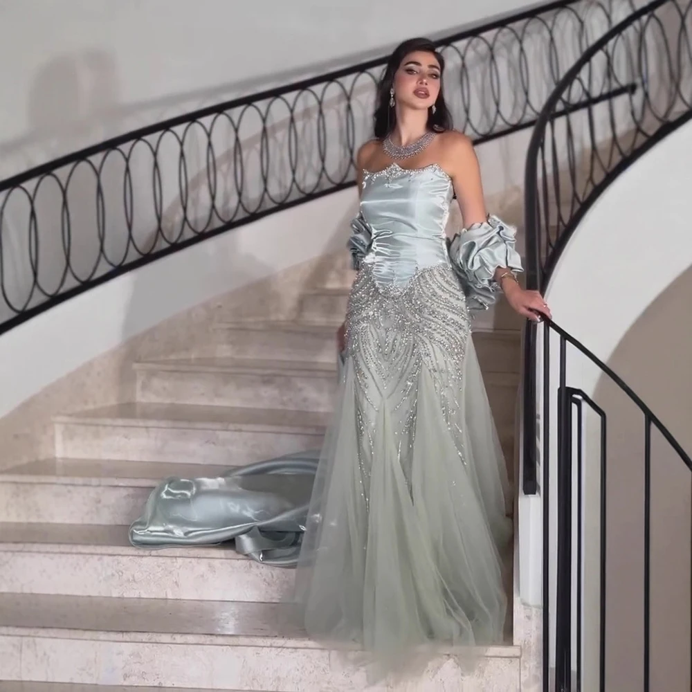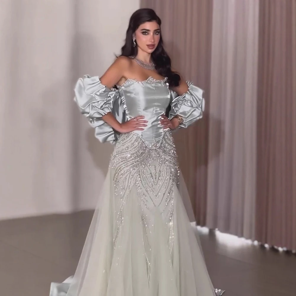 Luxury Sage Green Beaded Mermaid Evening Dress with Balloon Sleeves LA73198